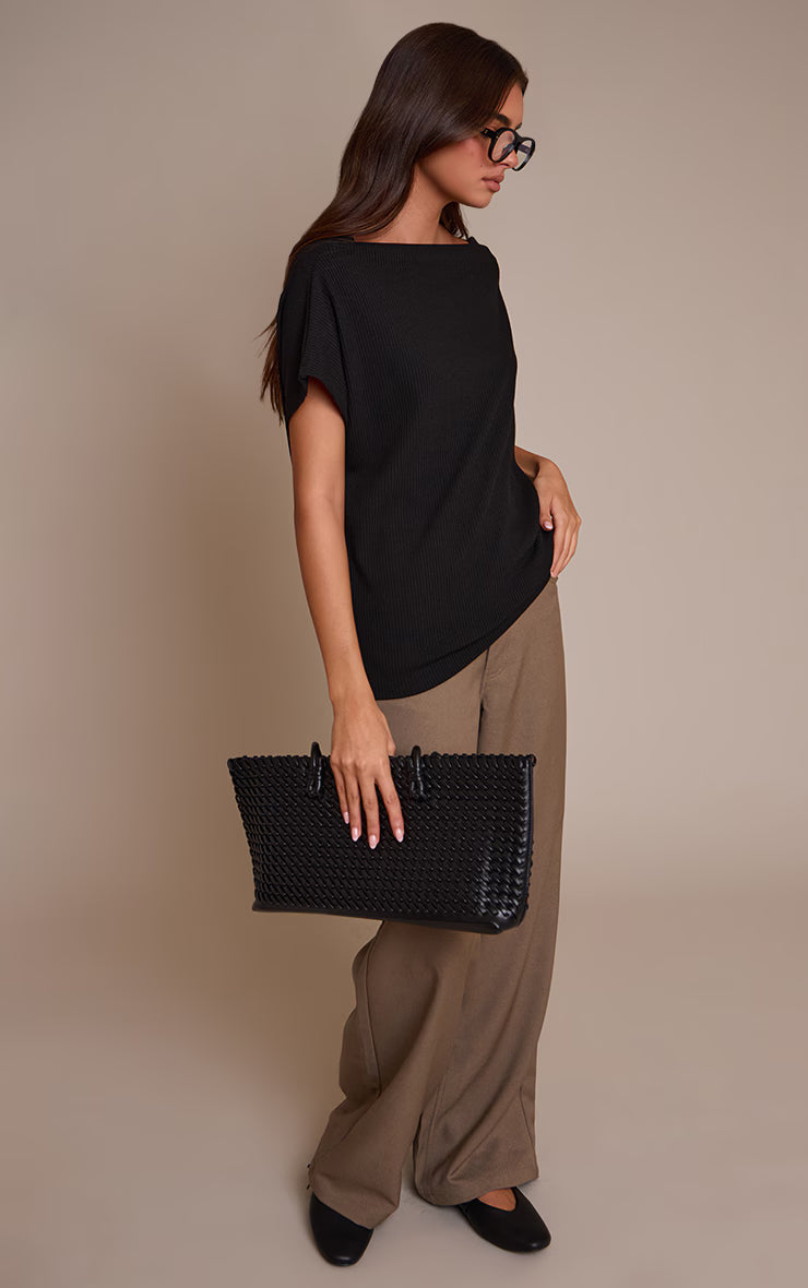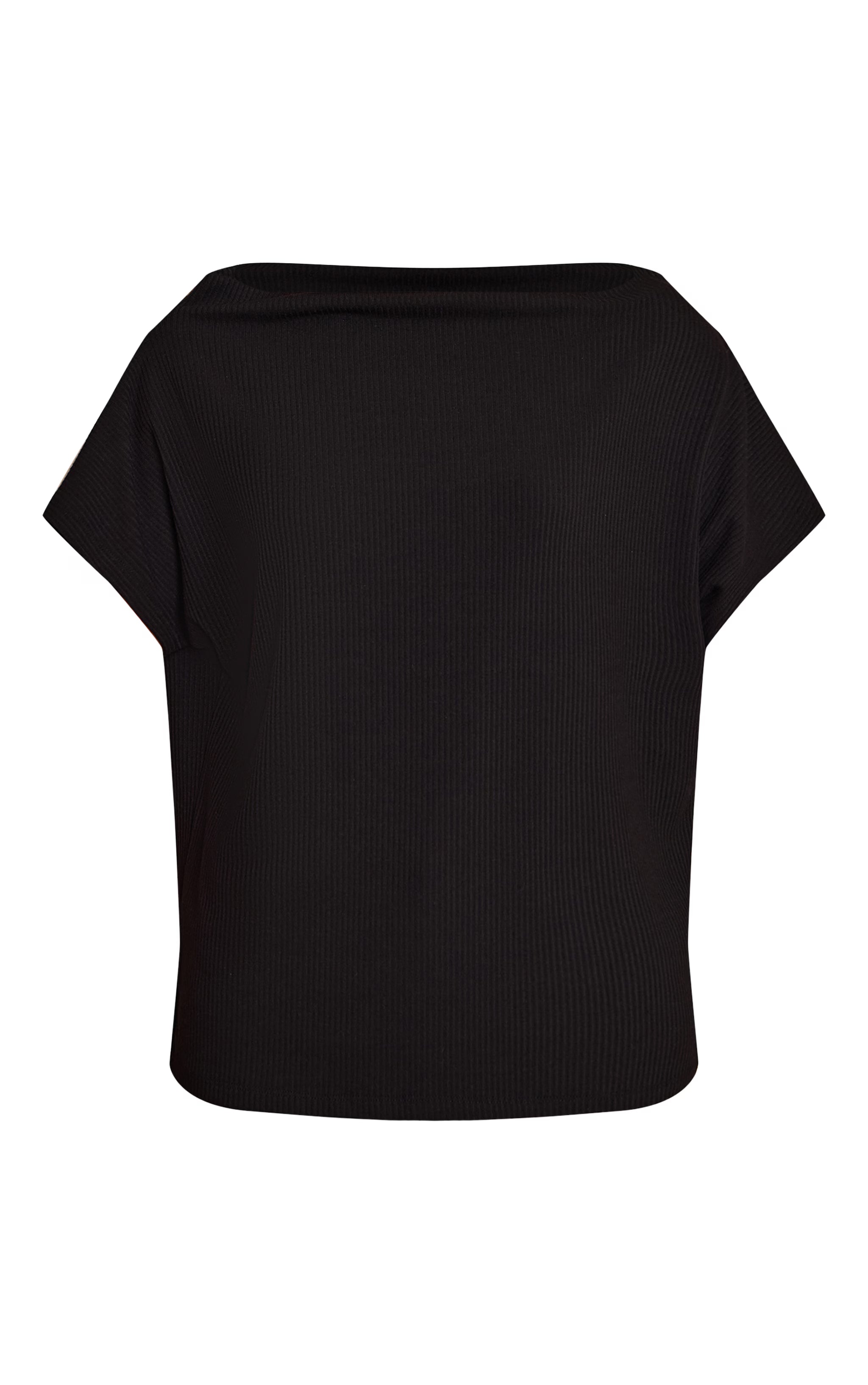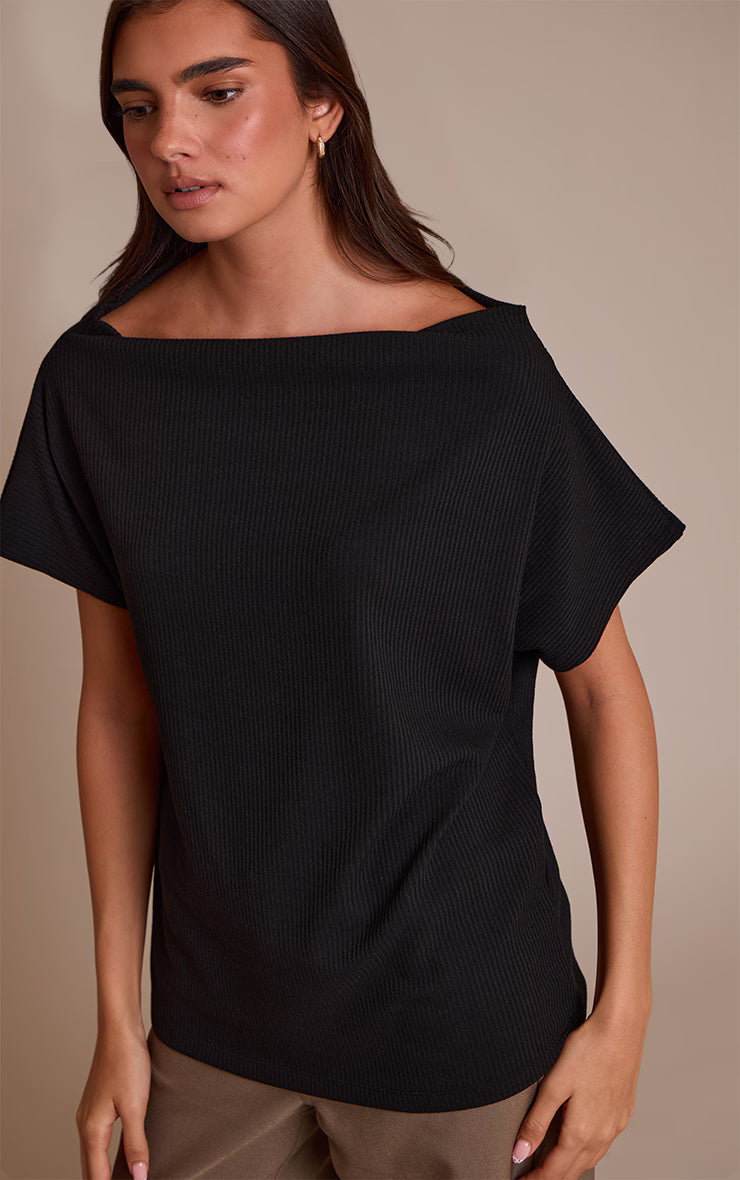 Anchor your everyday edit with a top that masters modern ease. The black thick rib asymmetric slouchy long top refines your rotation, showcasing a distinctive slouchy fit and a chic asymmetric neckline that drapes with an understated confidence, complemented by relaxed short sleeves and an extended length for a contemporary, relaxed finish. Pair this versatile black top with tailored wide-leg pants for a refined daytime look, elevated with sleek nude heels and subtle pearl earrings to complete the ensemble. It's the ultimate base for a look that’s effortlessly pulled-together, transitioning seamlessly from day appointments to casual evening plans.