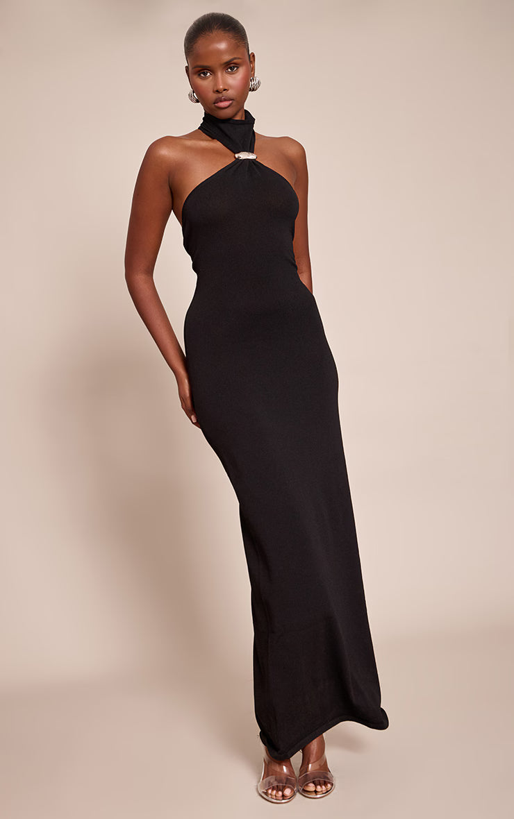 Turn heads this evening with a piece that defines modern sophistication. The black trim halter neck knitted maxi dress elevates your after-dark aesthetic, boasting a sleek halter neckline artfully cinched by a striking silver-toned ring embellishment. This maxi-length design flows to create an elongated silhouette, perfect for any special occasion. Pair this essential with sharp heeled mules and a minimalist black clutch, completing the ensemble with subtle gold stud earrings for a refined finish that speaks volumes.