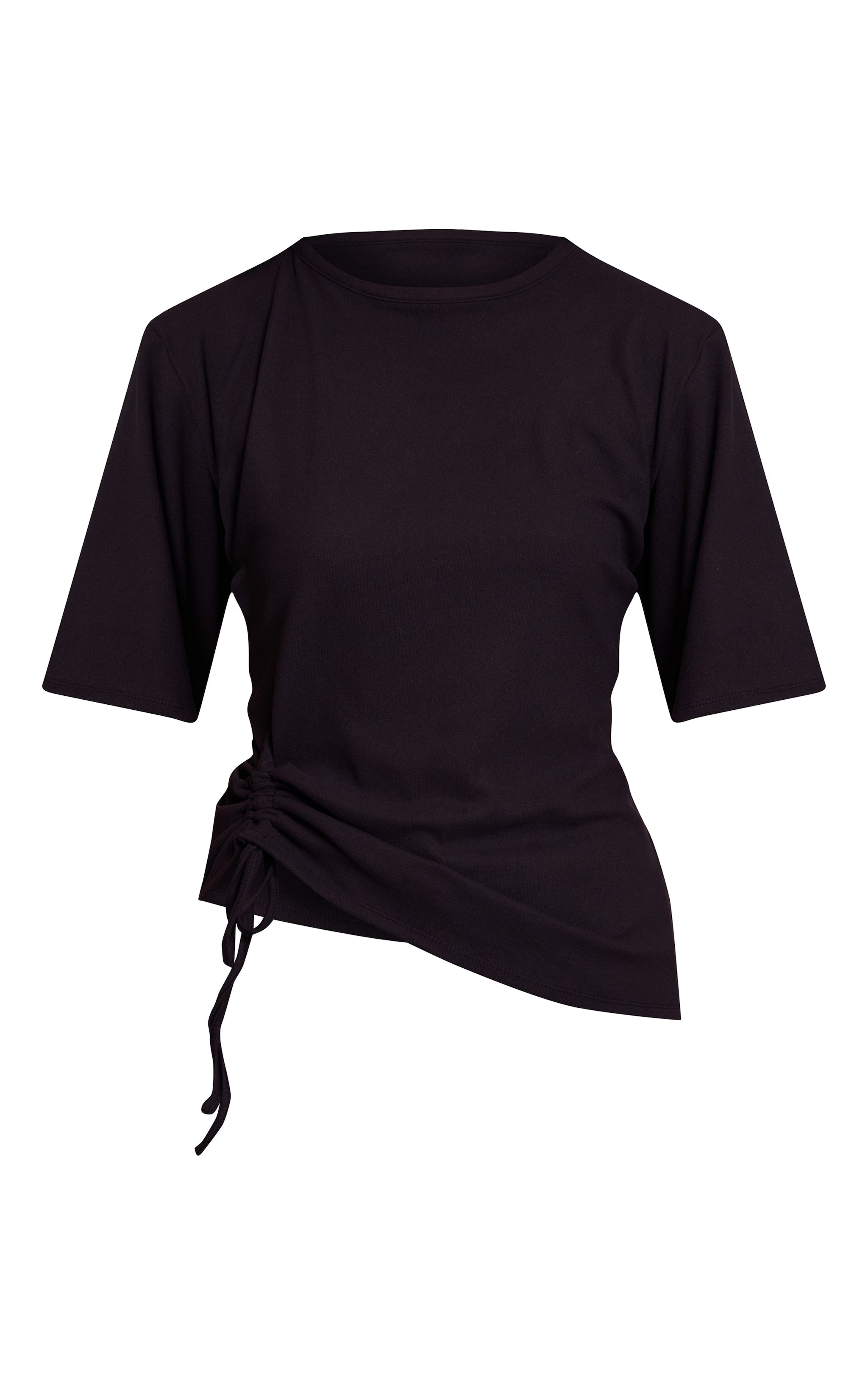 Master the art of understated cool; the black ultra soft oversized ruched detail t shirt redefines the essential top. Its relaxed, oversized cut delivers an effortlessly modern profile, complemented by a classic crew neckline. The standout ruched detailing along the side, complete with adjustable ties, allows for a personalised fit, adding an artful touch to its simple design. Pair this versatile piece with tailored wide-leg pants for a polished day look, grounded with sleek boots and elevated by a subtle pair of gold earrings for an aesthetic that speaks volumes without trying too hard.