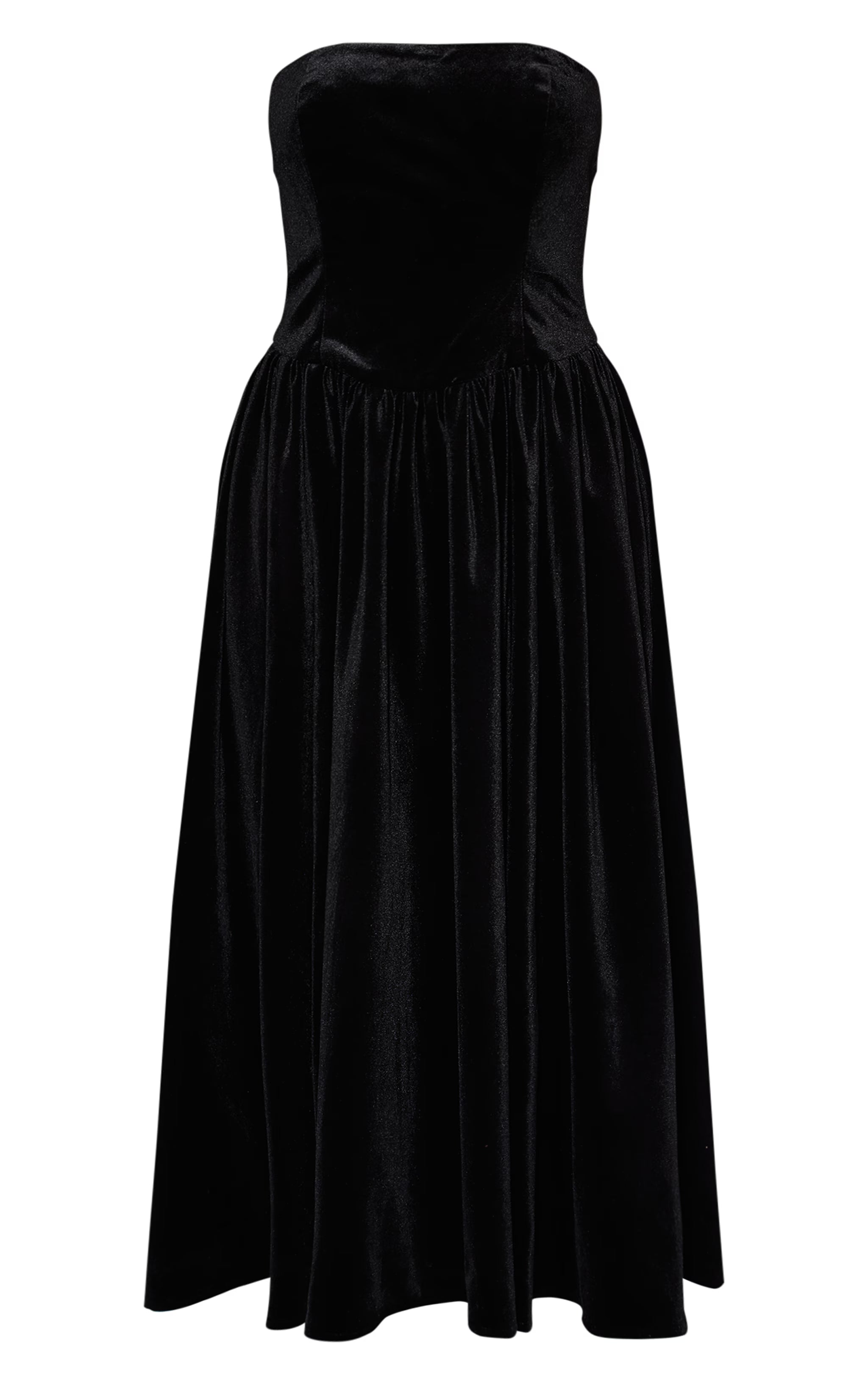 Channel refined confidence with this essential for after-dark moments. The black velvet bandeau maxi dress defines your silhouette with a sleek bandeau neckline and a meticulously fitted bodice, falling to a generously full maxi skirt from a cinched waist. For an unexpected yet undeniably fashion-forward aesthetic, style this statement piece with sharp mid calf boots and delicate gold stud earrings. It's an artful blend of classic elegance and contemporary edge, designed for the professional who knows exactly how to make an impact.