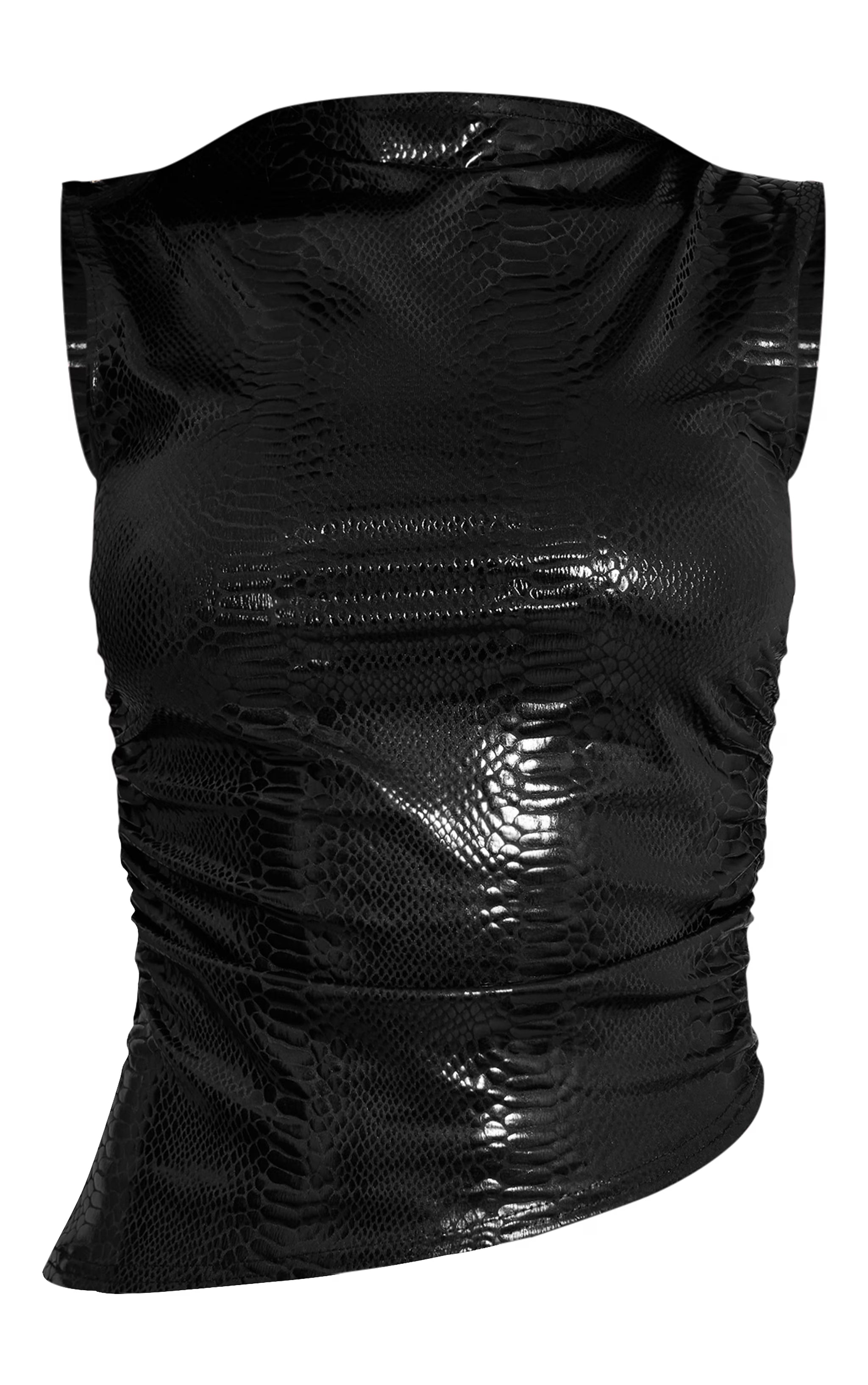 Command the evening with a directional statement. The black wet look croc print asymmetric top redefines after-dark allure with its distinctive high mock neck and artfully gathered side detailing that creates an effortlessly unique, asymmetric hem. Its sleek sleeveless design ensures a polished profile, perfect for making an impact. Pair this confident top with sleek tailored pants for a sharp contrast, or opt for the matching croc print mini skirt to curate a cohesive ensemble. Ground your look with polished black heels and a chic black bag, completing a self-assured vision that speaks to undeniable modern appeal.