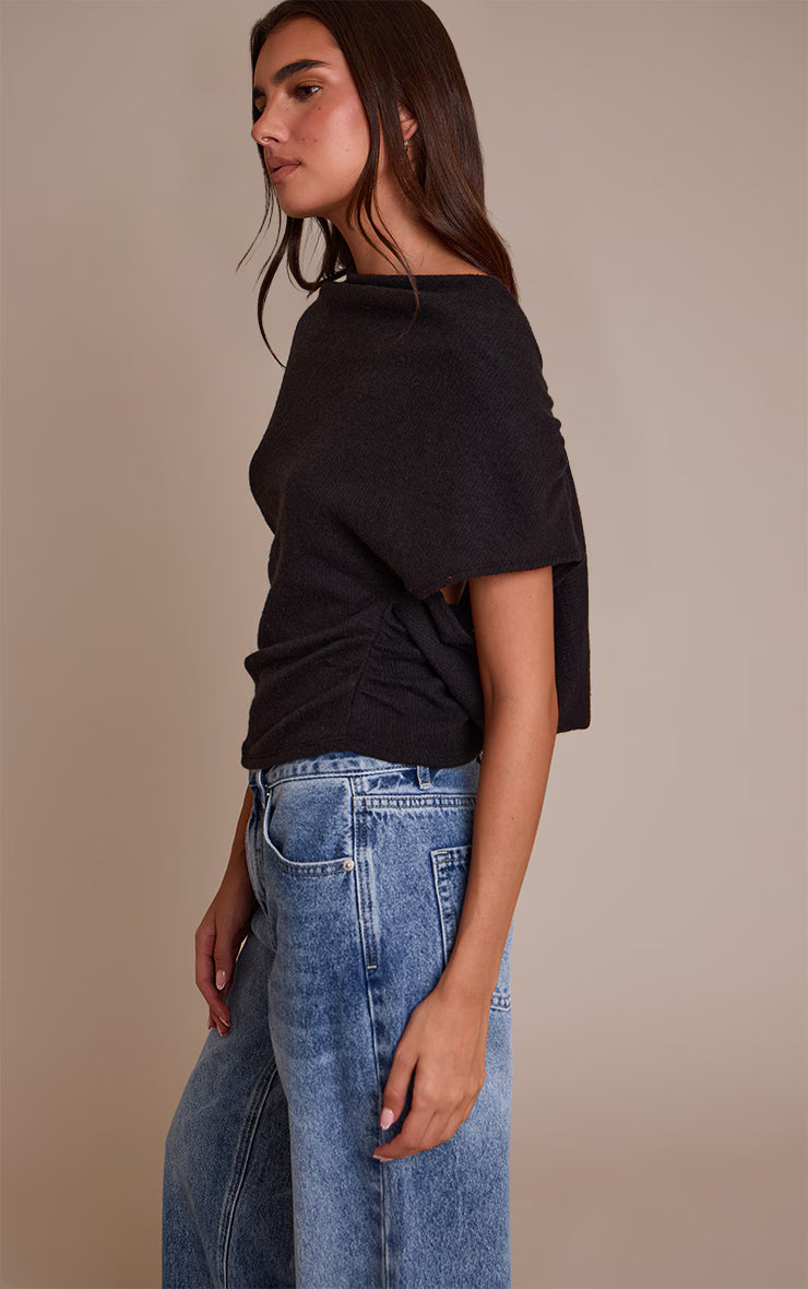 Master directional styling from every angle with the black wool look slouchy tie back top, redefining casual cool. This essential piece offers a relaxed, slouchy fit and a striking open back, artfully secured by a delicate tie fastening that creates an understated draped silhouette. Pair this versatile top with high-waisted jeans for an elevated daytime aesthetic, or switch to tailored pants and sleek white kitten heels for a refined transition. Complete the look with some minimal gold hoops, making an effortless statement that’s undeniably you.