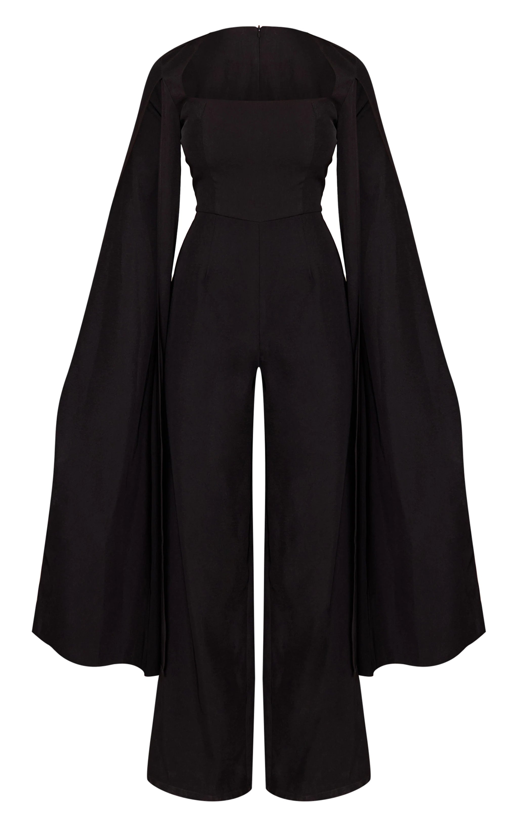 Embrace modern tailoring with the black woven cape sleeve wide leg jumpsuit. Made from structured woven fabric, this jumpsuit features dramatic cape sleeves and a wide-leg cut for a contemporary, confident aesthetic. Style with heels and minimal jewelry for a statement event look.