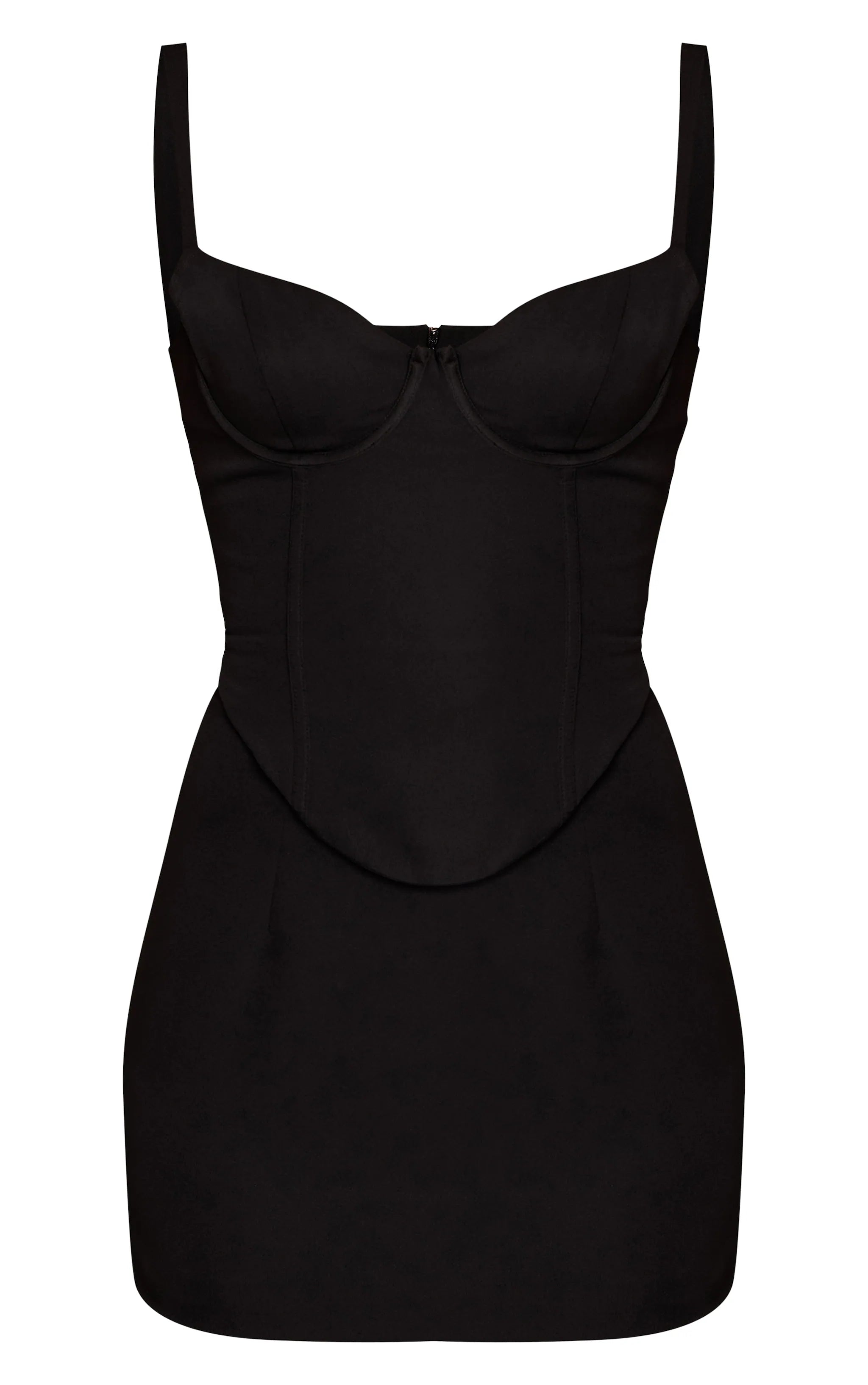 Make your statement after sundown. The black woven corset detail mini bodycon dress defines sophisticated allure with its expertly tailored bodice, complete with visible seaming and a flattering sweetheart neckline, creating a powerful silhouette. The sleek mini length and bodycon cut ensure an impactful presence for any evening occasion. Complete this confident look with sharp white kitten heels and a pair of minimalist stud earrings, ready for any occasion where you set the agenda.