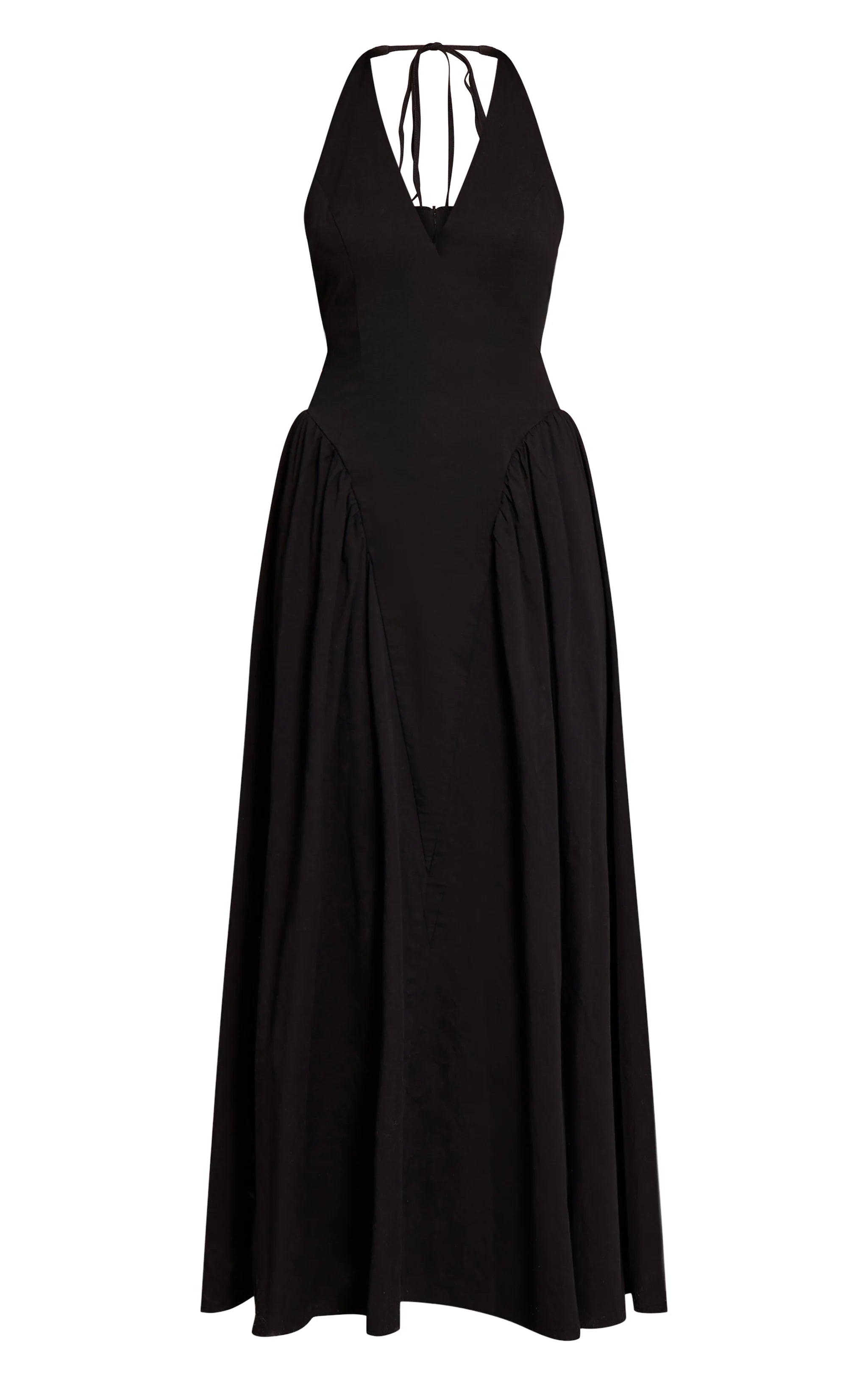 Redefine your approach to polished day dressing. The black woven halterneck plunge midaxi dress delivers a sophisticated outline, featuring a distinctive halterneck that seamlessly transitions into a confident V-plunge neckline. Its artfully structured bodice cinches the waist, flowing into a graceful midaxi skirt with subtle, architectural pleats that add dimension and movement. This piece is perfect for a curated daytime ensemble; style it with nude heels for an elongated profile, and complete your look with a bold cuff or subtle gold jewelry to reflect an assured aesthetic. It's the ultimate canvas for self-expression, designed for those who dress with intent.