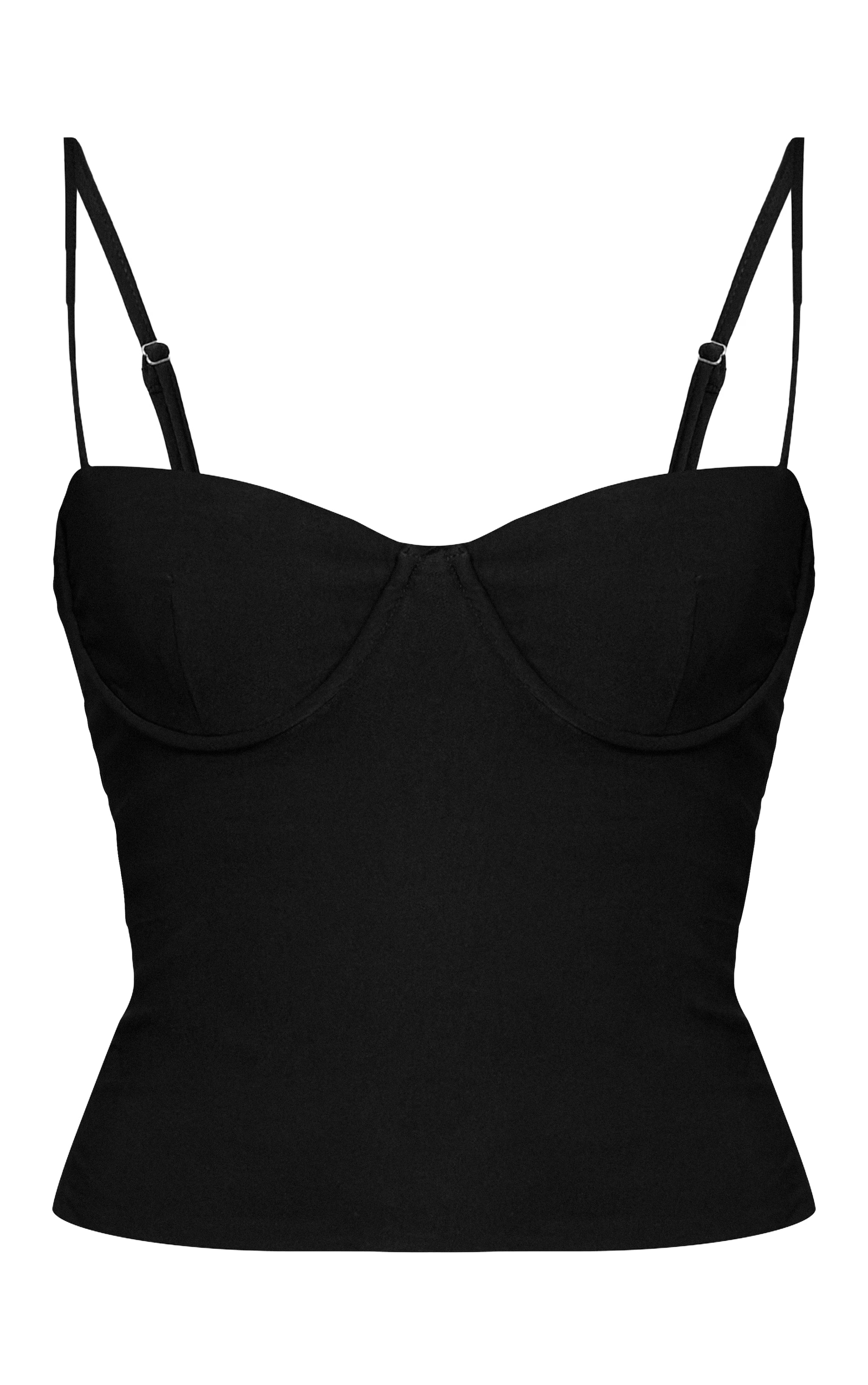 Designed to define your silhouette, this black woven stretch strappy cami top delivers sharp elegance. It's defined by its structured sweetheart neckline and delicate spaghetti straps, framing the decolletage with knowing precision. The tailored cut provides a clean, confident form. Pair this versatile cami with sharply tailored wide-leg pants or a sleek ruched midi skirt. Then, complete your look with some striking knee-high boots and a minimalist clutch bag, ensuring an effortlessly artful aesthetic, ready for any after-dark moment.