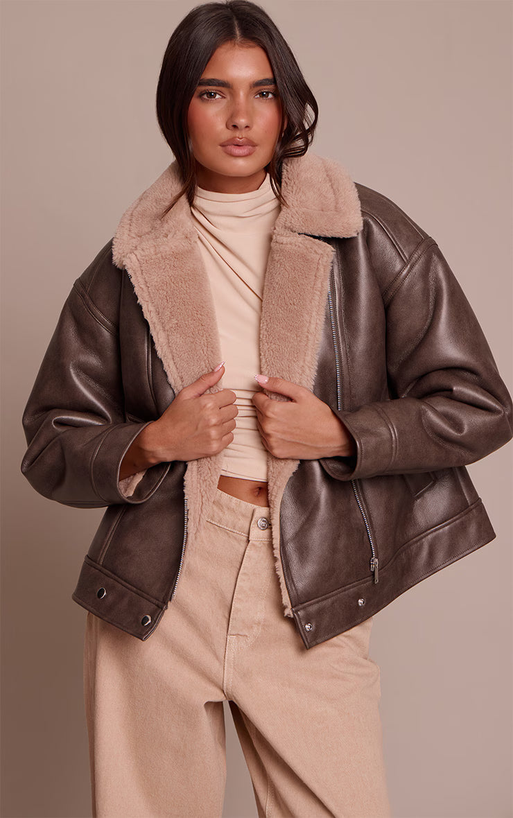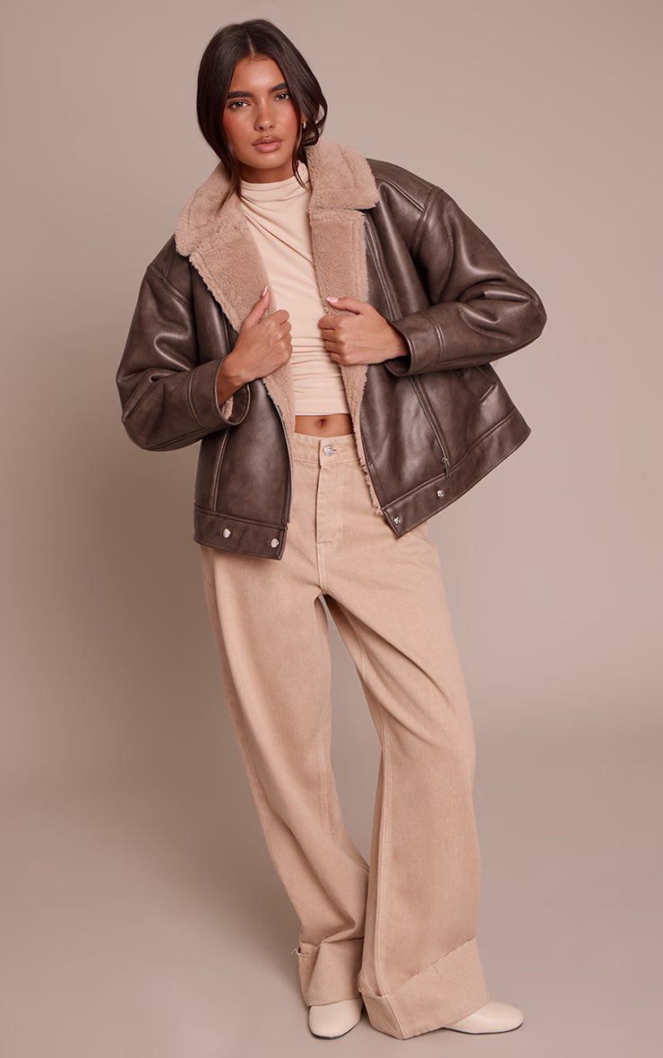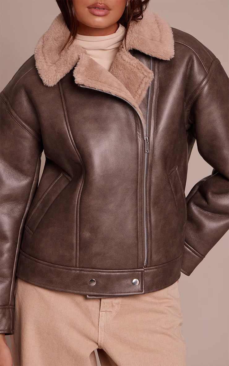 Channel an enduring appeal with a modern edge in this standout coat. The brown borg collar faux leather aviator presents a confident, oversized cut, distinguished by its wide borg collar and bold asymmetric zip fastening. Subtle silver-tone hardware enhances the relaxed structure, flowing into a clean hem with snap detailing. For a chic daytime ensemble, layer this over a neutral knit and wide-leg pants. Finish the look with artfully understated silver jewelry and a pair of contemporary kitten heels to navigate any agenda with knowing style.