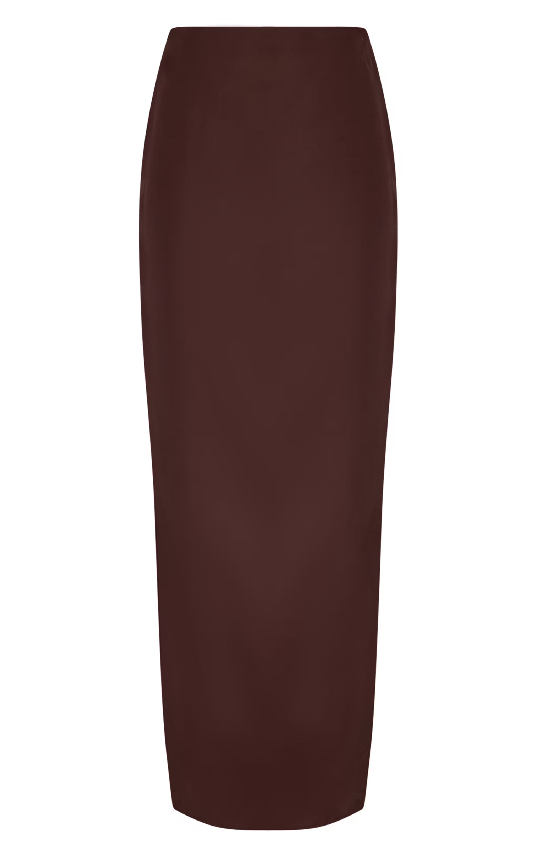 Capture confident energy after dark with the brown chiffon maxi skirt. This artful piece boasts a dynamic brown and rust print that catches the eye, featuring a sleek maxi cut designed to drape effortlessly. Its knowing design elevates any evening look. Pair yours with a refined halter neck top and towering black heels, completing the ensemble with a chic clutch bag for an impactful statement.