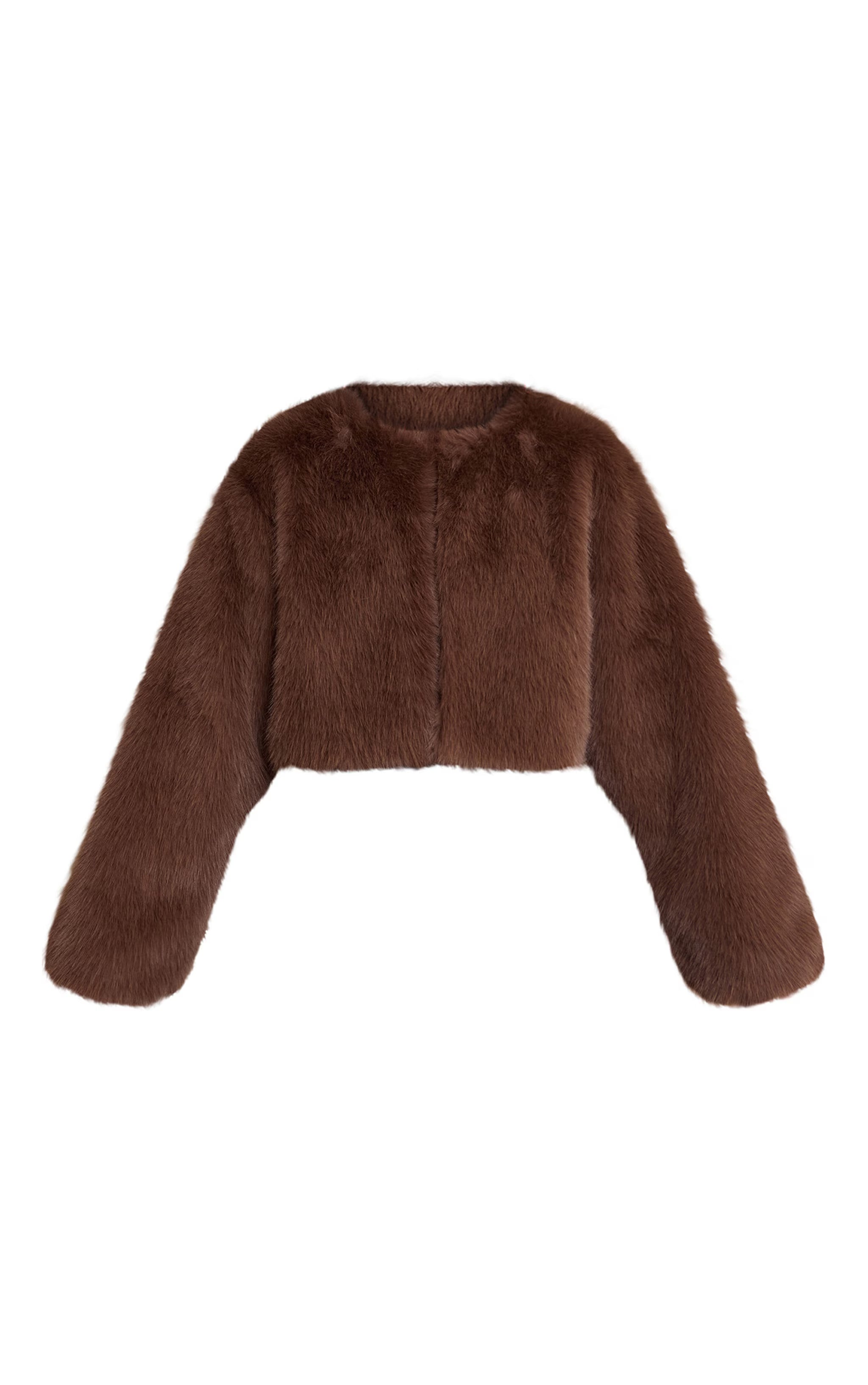 A confident approach to day layering starts here. The brown cropped fur coat makes an immediate statement, cut with a relaxed, boxy silhouette and finishing just above the hip, making it the perfect piece to balance high-waisted pants or skirts. Its collarless design and long, subtly voluminous sleeves bring an artful ease to any look. Complete your aesthetic with crisp tailored pants and a simple top, then step into elegant nude heels, adding some delicate gold earrings for an effortlessly polished ensemble that owns the day.