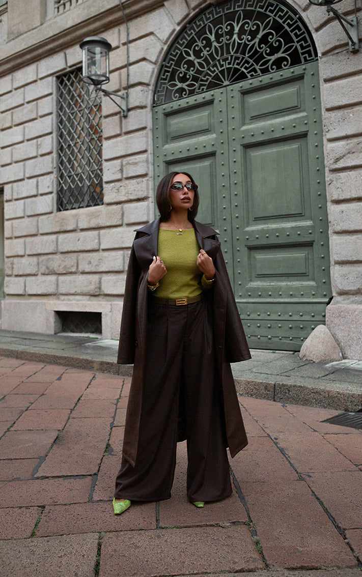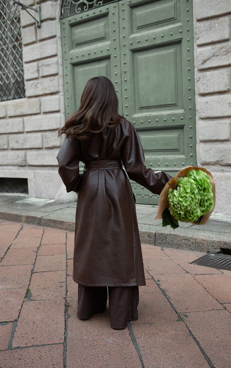 Make a statement in outerwear with the brown faux leather maxi trench coat. Cut from brown faux leather, this trench is designed with a longline maxi fit and a belted waist to accentuate the silhouette. Layer over knitwear and knee boots for an effortlessly elevated look.