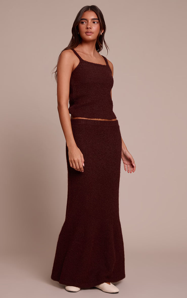 Effortless styling starts here with the brown knitted cami top. This piece boasts a clean square neckline and wide, supportive straps, crafting a defined silhouette perfect for daywear. Its rich brown hue and distinctive knit offer a sophisticated take on a classic cut. Pair this versatile top with its coordinating midi skirt for a cohesive aesthetic, or style it with tailored wide-leg pants for a sharp, contemporary edge. Complete your ensemble with sleek ankle boots and a polished gold ring to define your confident daywear.