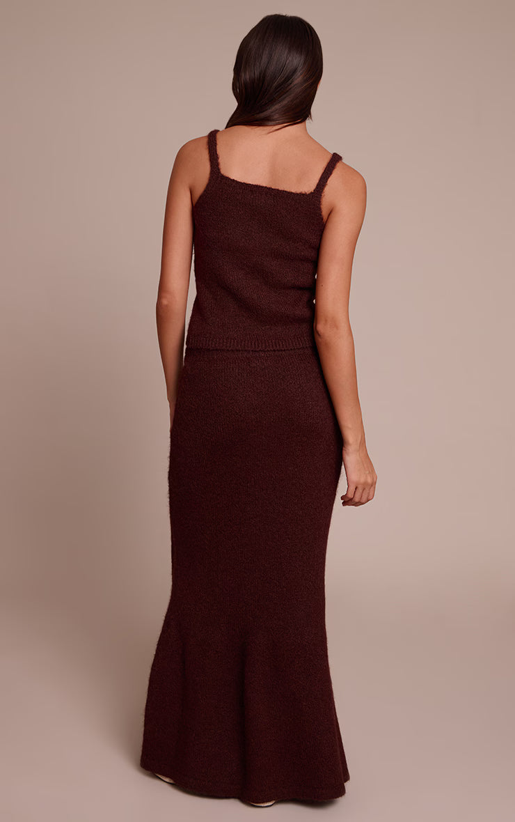 Defining daywear with ease, the brown knitted maxi skirt brings a refined simplicity to your everyday rotation. Its sleek, elongated silhouette falls gracefully to a subtle flare at the hem, crafting an effortlessly chic line for versatile styling. Pair this essential piece with its coordinating knitted top for a streamlined look, or style it with a crisp button-down shirt and modern flats. Complete your ensemble with delicate gold jewelry for an understated yet polished finish, proving your daywear is anything but basic.