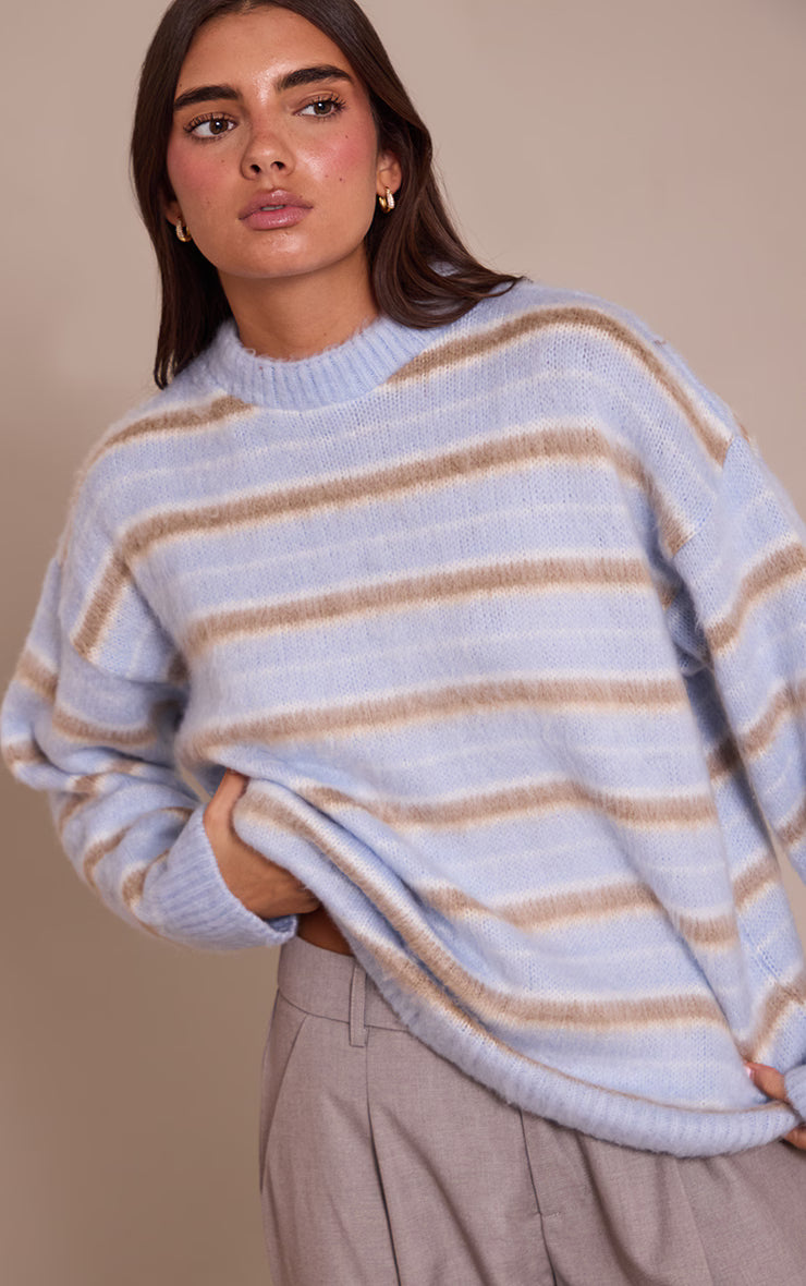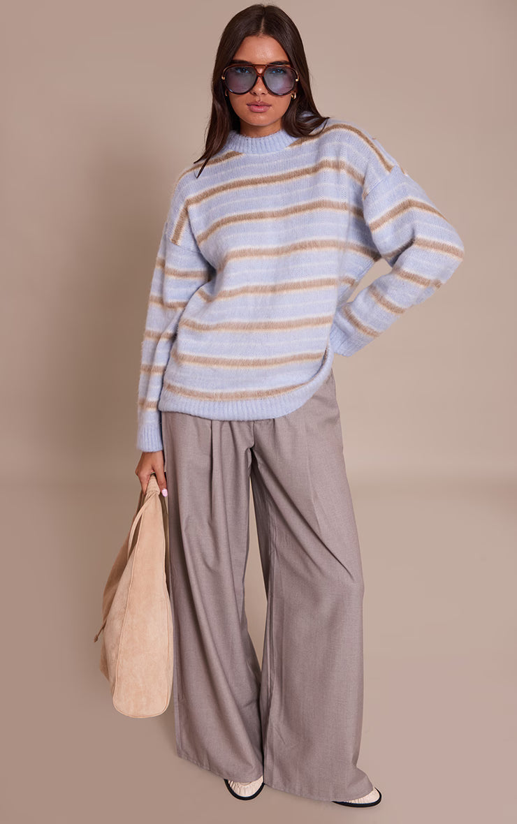 Update your knitwear staples with the brown striped brushed knit sweater. Crafted from super-soft brushed yarn in warm brown and cream stripes, this sweater has a relaxed fit and dropped shoulders for effortless comfort. Team with wide leg jeans and sneakers for a laid-back weekend look.
