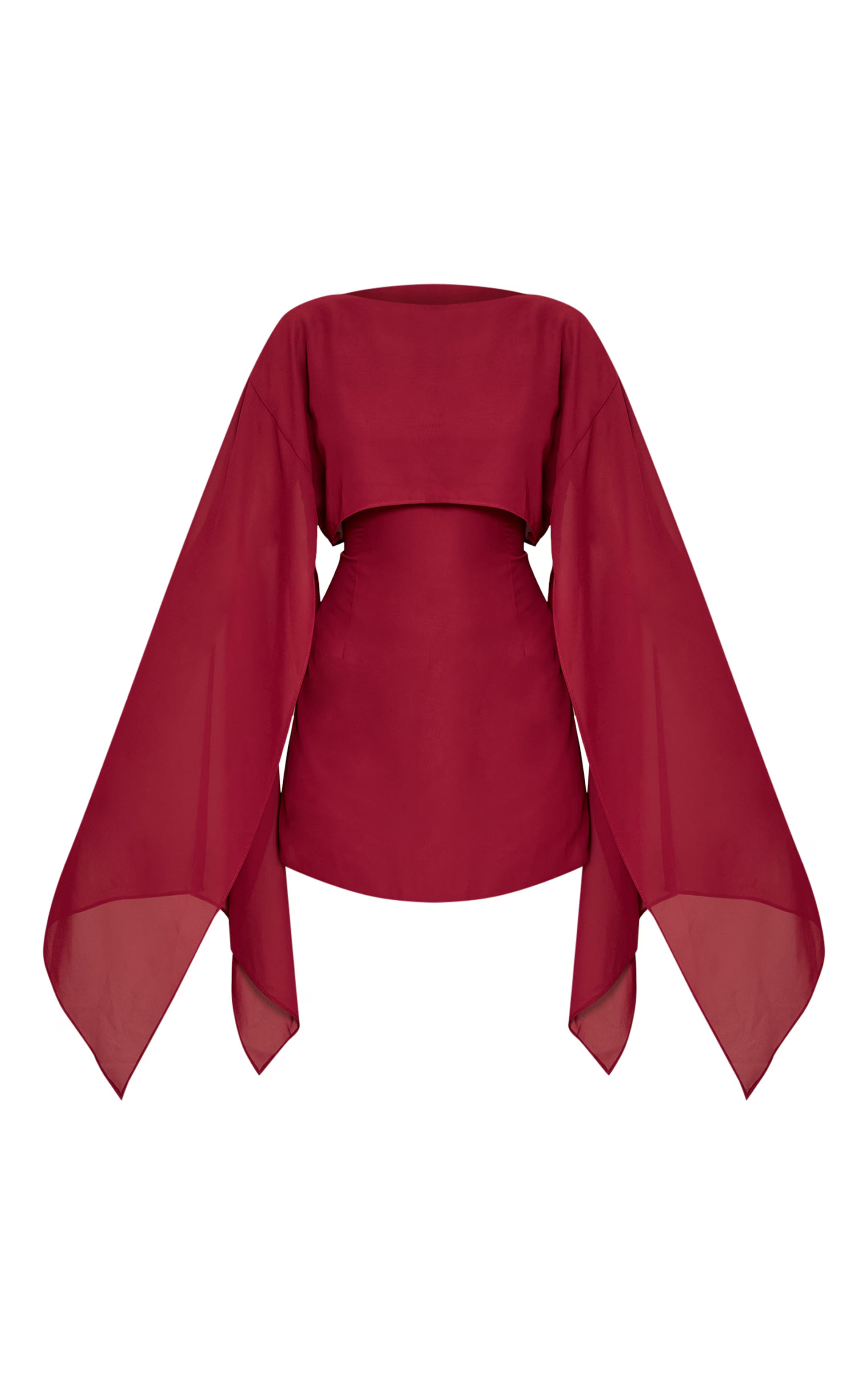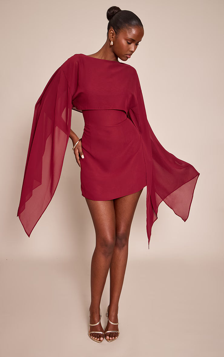 An artful drape meets an ultra-modern silhouette with the burgundy cape detail mini dress. This striking piece features a bold cape overlay and a flattering mini cut, designed for effortless impact. Elevate this occasion-ready dress by pairing it with chic **high heels** and a sophisticated **woven clutch bag** to complete your confident ensemble.