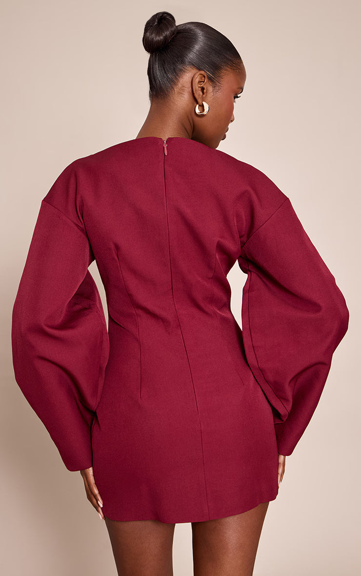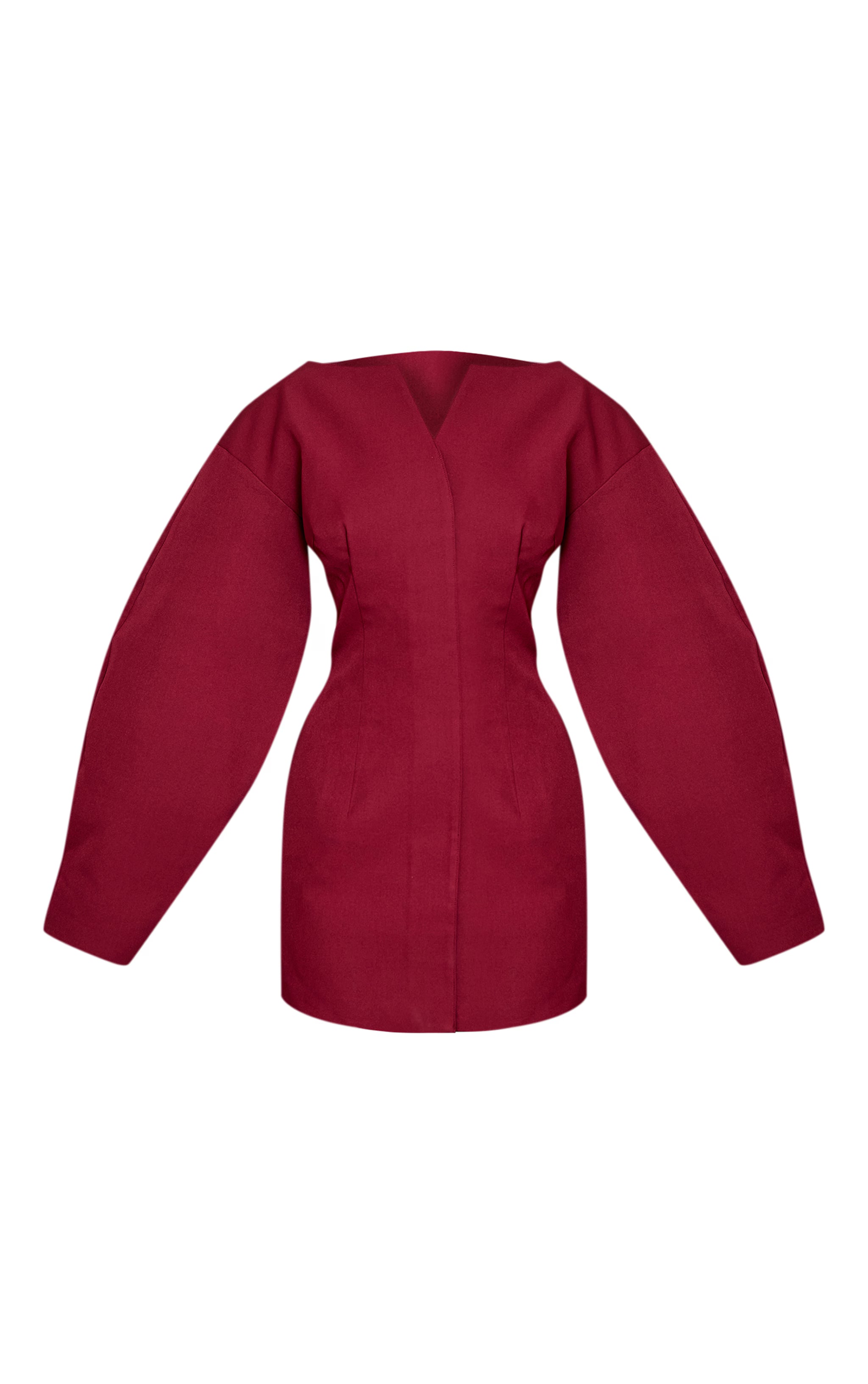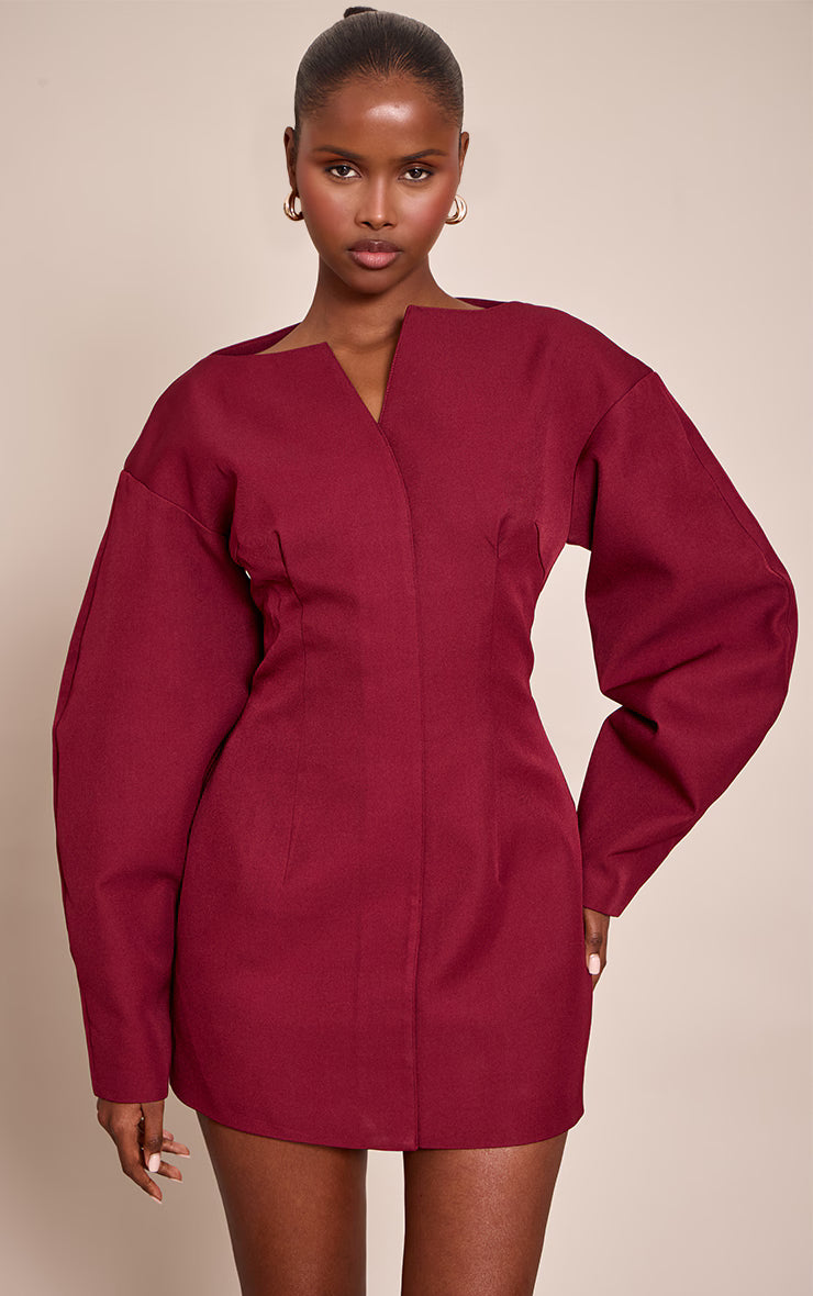 Define your occasionwear rotation with an assured statement. The burgundy cocoon sleeve cinched waist blazer dress presents a bold design, beginning with its rich hue and dramatic cocoon sleeves that build a confident shoulder. A neatly cinched waist then sculpts a flattering shape, flowing into a tailored mini length, perfectly framed by a striking notched V-neckline. Elevate this powerful ensemble with sleek gold strappy heels and a delicate gold ring to curate an aura of effortless, considered confidence. This is how you master the art of unforgettable style.