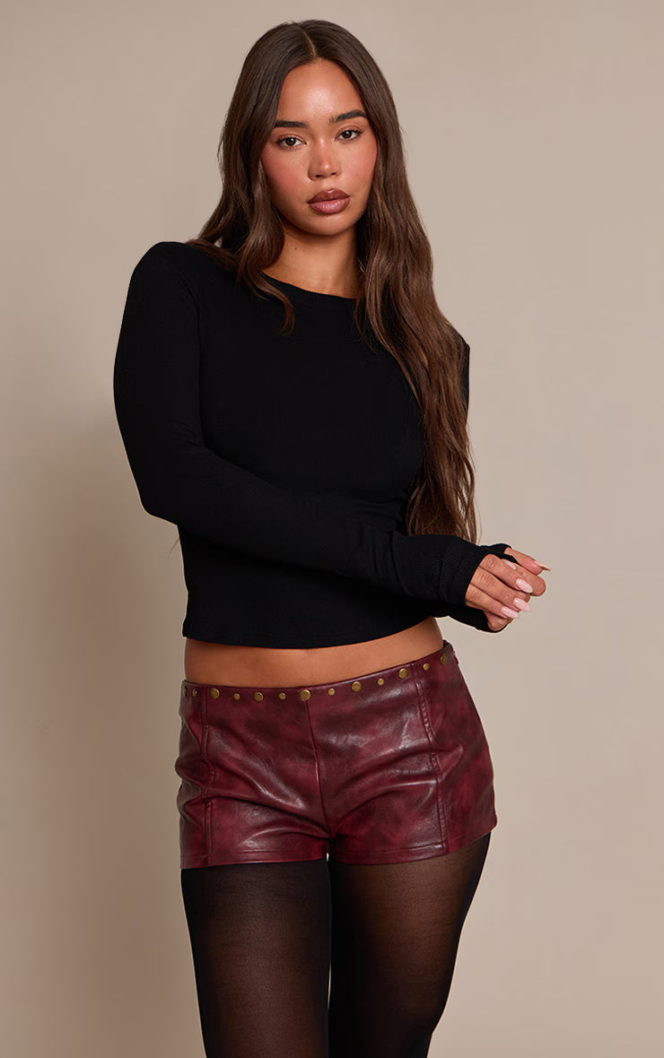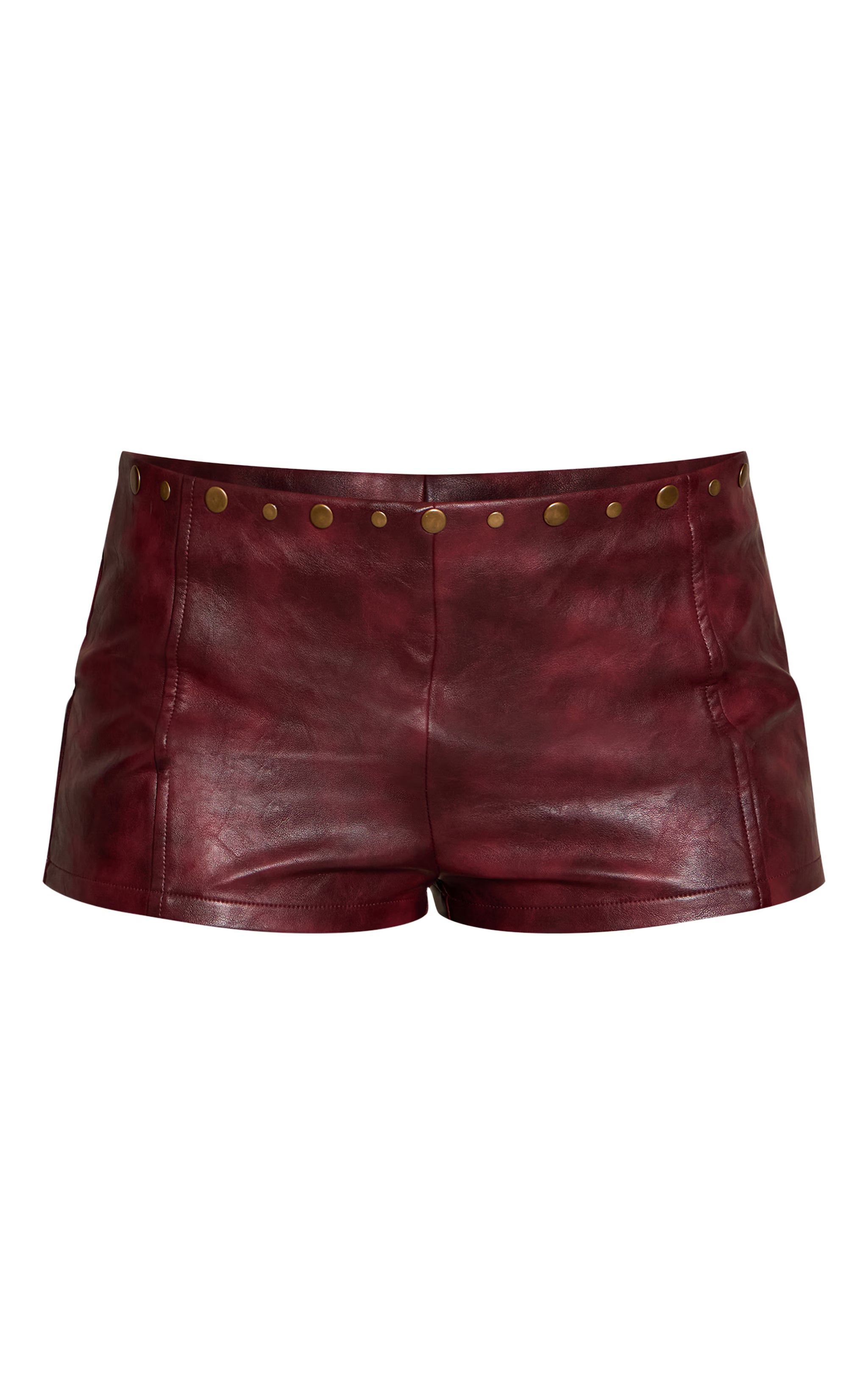 Channel bold energy with these burgundy faux leather studded hot Pants. With their eye-catching hue and studded details, they’re perfect for making a statement. Style with a mesh bodysuit and platform heels for a night-out edge, or go casual with a cropped hoodie and sneakers.