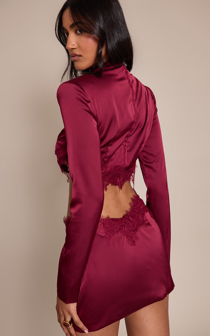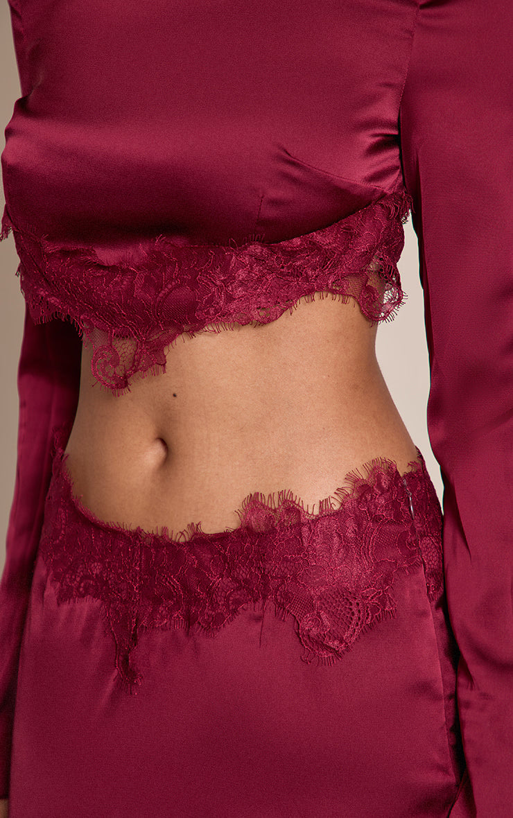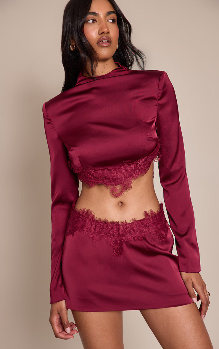 Own the evening in a look that marries sharp design with delicate embellishment. This burgundy satin lace trim high neck long sleeve top presents a commanding silhouette with its high neckline and long sleeves, perfectly balanced by a daring cropped cut and intricate lace detailing along the hem. Paired seamlessly with its matching mini skirt, it creates a cohesive ensemble ready for any event. Anchor this confident statement with sleek strap heels, adding a touch of understated gold jewelry to complete your evening aesthetic. A truly artful choice for making a memorable impression.