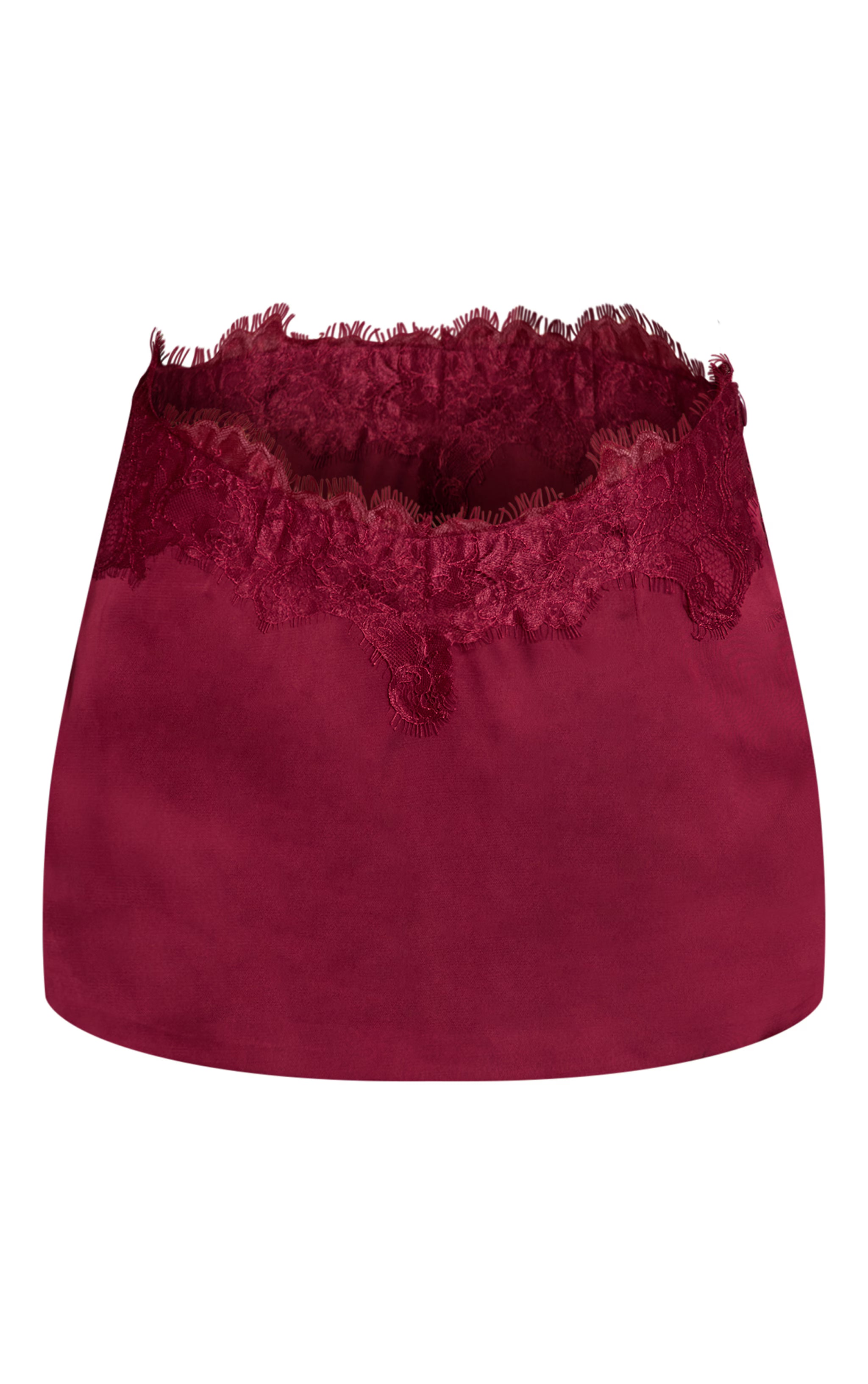 Embrace a knowing allure with this essential piece for your evening edit. The burgundy satin lace trim mini skirt is cut to a confident mini length, featuring delicate lace trim that subtly defines the hem. Its sleek silhouette is perfectly poised for after-dark statements, offering a refined edge. For a cohesive and elevated look, pair this skirt with a tonal satin crop top or a sharp camisole, completing your ensemble with sophisticated black kitten heels and a minimalist black bag to own the night with undeniable confidence.