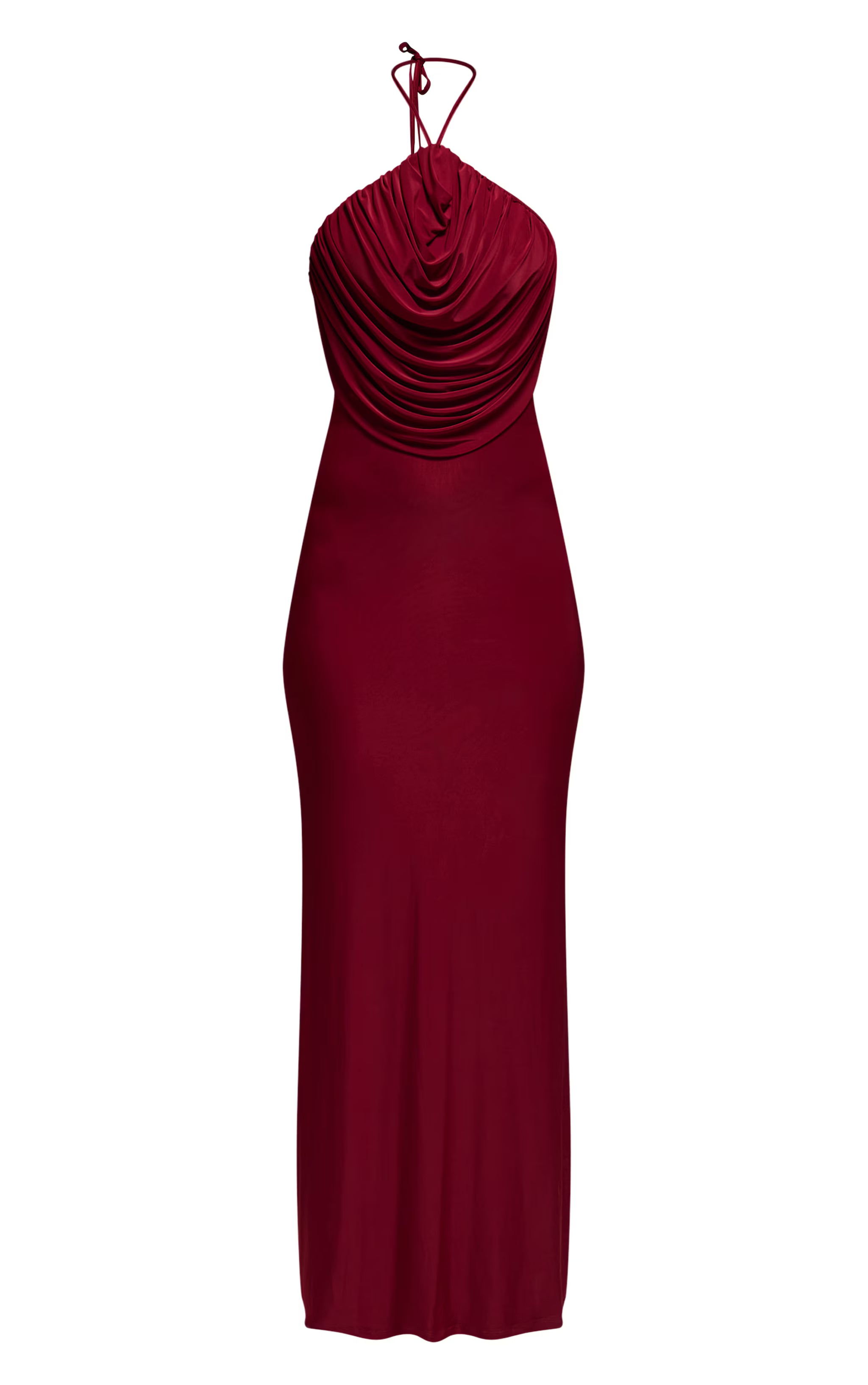 The rich burgundy hue, paired with an exquisite design, sets a knowing tone for any occasion. This burgundy slinky halterneck draped detail maxi dress showcases an elegant halter neckline flowing into an intricately ruched bust detail, creating a sophisticated silhouette. The long, graceful cut gently traces the figure, extending to a refined maxi length that embodies modern poise. Complement this essential with sophisticated gold heels and a sleek black shoulder bag for an evening look that leaves a lasting, confident impression.