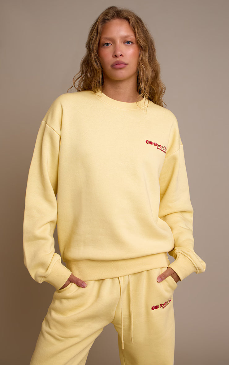 Cultivate an air of knowing ease with a piece that masters elevated casual. The buttercream oversized boston usa embroidered Sweatshirt, in a fresh butter cream hue, delivers a relaxed fit with a classic crew neckline and dropped shoulders, instantly elevating your day wear. Its subtle red 'Boston USA' embroidery on the chest adds a collegiate touch without sacrificing sophistication. For a cohesive statement, pair it with coordinating sweatpants, or for an artful contrast, style it with tailored wide-leg pants. Finish the look with sleek ballet flats and a stack of subtle gold rings for a confident, put-together aesthetic.