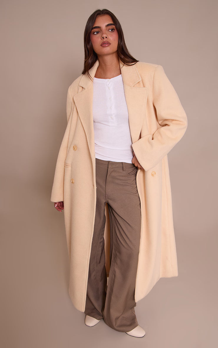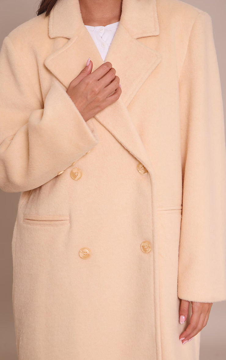 Stay cozy in style with the buttercream structured double breasted wool look maxi coat. The longline silhouette and tailored fit offer polished warmth for any occasion. Layer over tailored pants and heeled boots for work, or throw over a bodycon dress with heels for chic evening elegance.