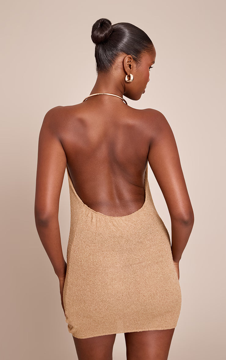 Make a statement in the camel gold cuff detail knitted mini dress, designed to turn heads for your next evening occasion. This mini dress features a daring plunge neckline and a flattering silhouette, enhanced by subtle gold cuff details that add a refined touch. Step out with confidence by pairing it with sleek **high heels** and a statement **gold ring** to complete this unforgettable look.