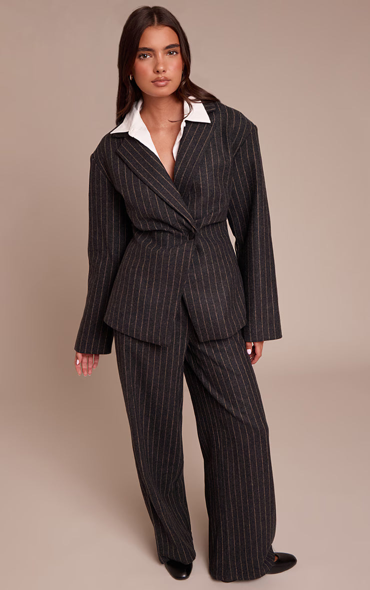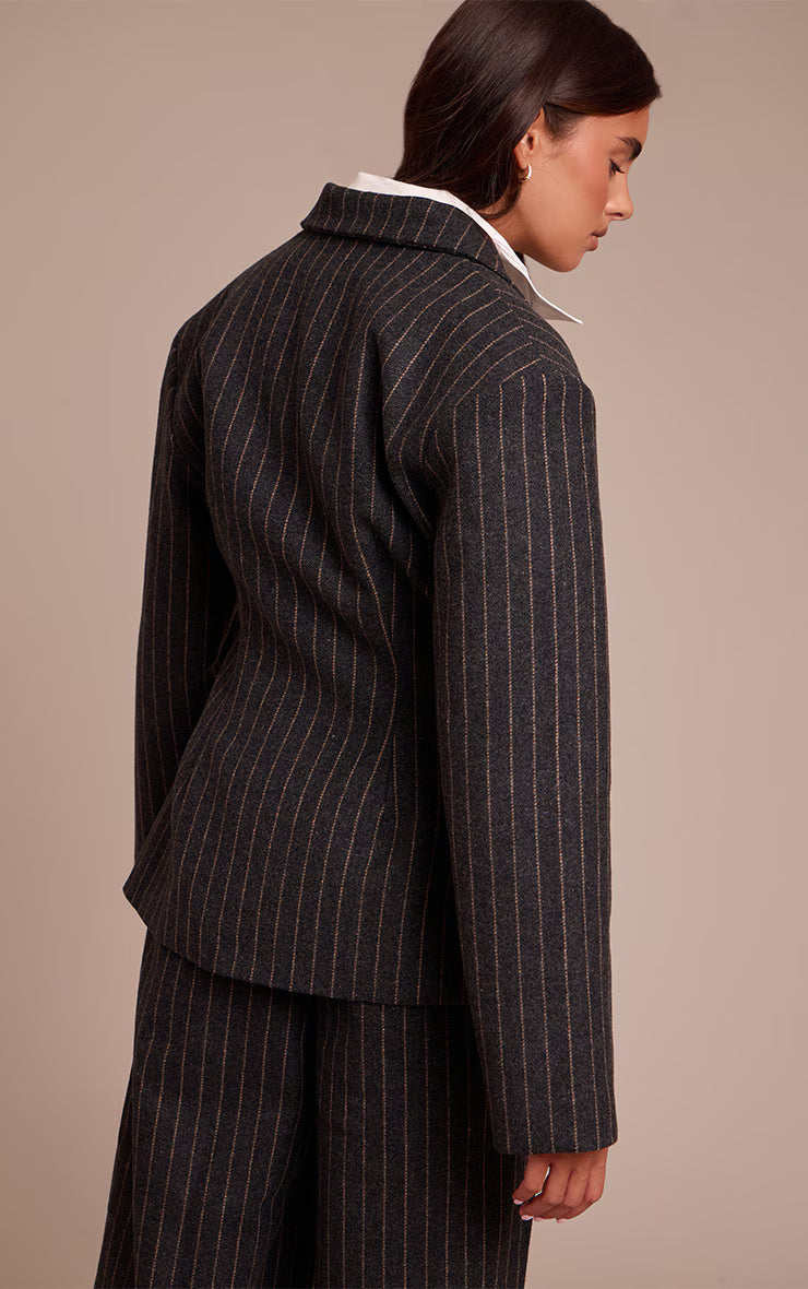 Refine your evening look with this charcoal grey brushed pinstripe cinched waist blazer. Designed in a charcoal grey soft brushed pinstripe material, this tailored blazer features structured shoulders and a cinched waist for a flattering fit that is endlessly versatile. Style with a pair of wide leg pants and a pair of point toe heels for an elegant power-dressing vibe.