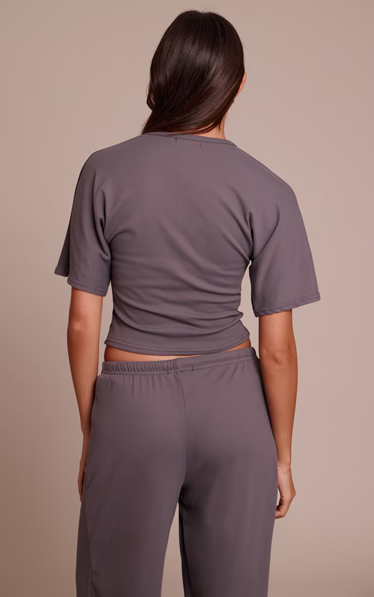 Your core edit starts here. The charcoal grey soft touch boxy t-shirt delivers a refined, relaxed silhouette with its classic crew neckline and wide, short sleeves that drape effortlessly. This versatile top is designed to anchor your daywear, perfect for teaming with its coordinating wide-leg pants for a cohesive two piece set, or lending an understated edge to crisp denim. Finish the ensemble with confident ankle boots, accessorising minimally with sleek gold earrings to define an aesthetic that's always intentionally composed.
