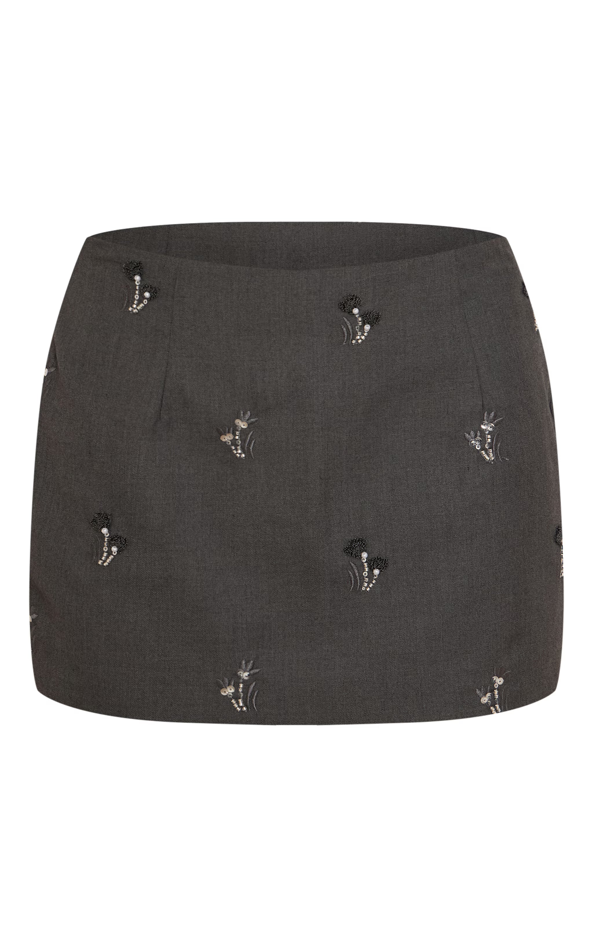 Stand out in this charcoal grey woven embroidered sequin detail mini skirt. Crafted from woven charcoal fabric with intricate sequin embroidery, this skirt adds a luxe touch. Team with a satin blouse or a bandeau top and strappy heels for party season glamour.