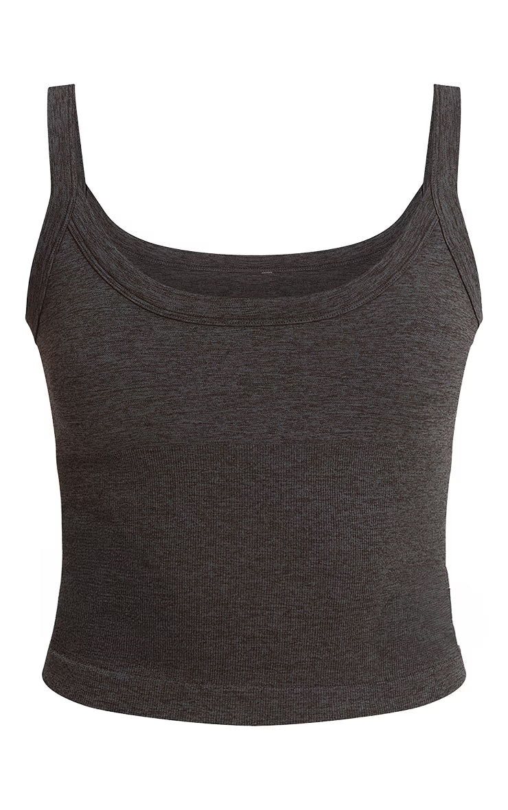 Keep your workout wardrobe elevated with the charcoal seamless marl double strap gym vest. Crafted from smooth seamless fabric in a marl grey tone, this vest features double straps and a flattering scoop neckline. Pair with matching leggings for a supportive and stylish gym combo.