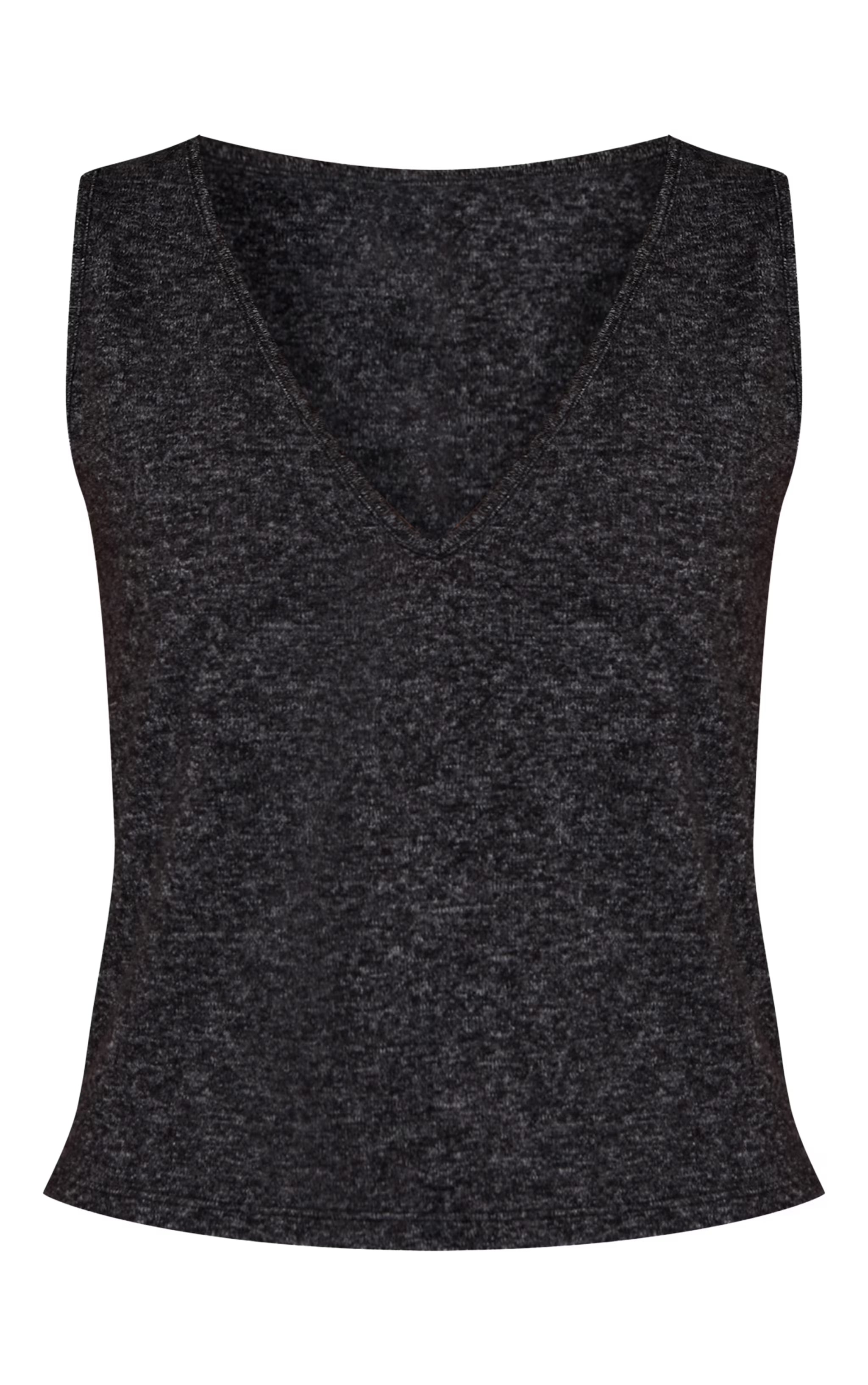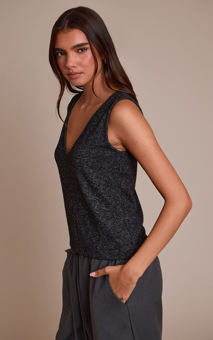 Your go-to for refined daytime ease just landed. This charcoal soft knit v neck slouchy Vest top offers a relaxed silhouette with its distinct deep V-neck. The charcoal grey hue makes it a versatile foundation piece for any wardrobe. Pair it with relaxed wide-leg pants and sleek ankle boots for a confident, understated ensemble, completing the look with delicate gold hoops for an elevated aesthetic.