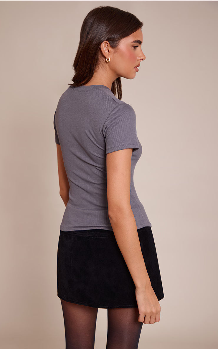 The charcoal soft rib crew neck short sleeve top is a timeless staple with an elevated finish. Its ribbed texture adds depth while the neutral tone makes it endlessly versatile. Wear it tucked into tailored pants or with denim for a refined yet relaxed aesthetic.