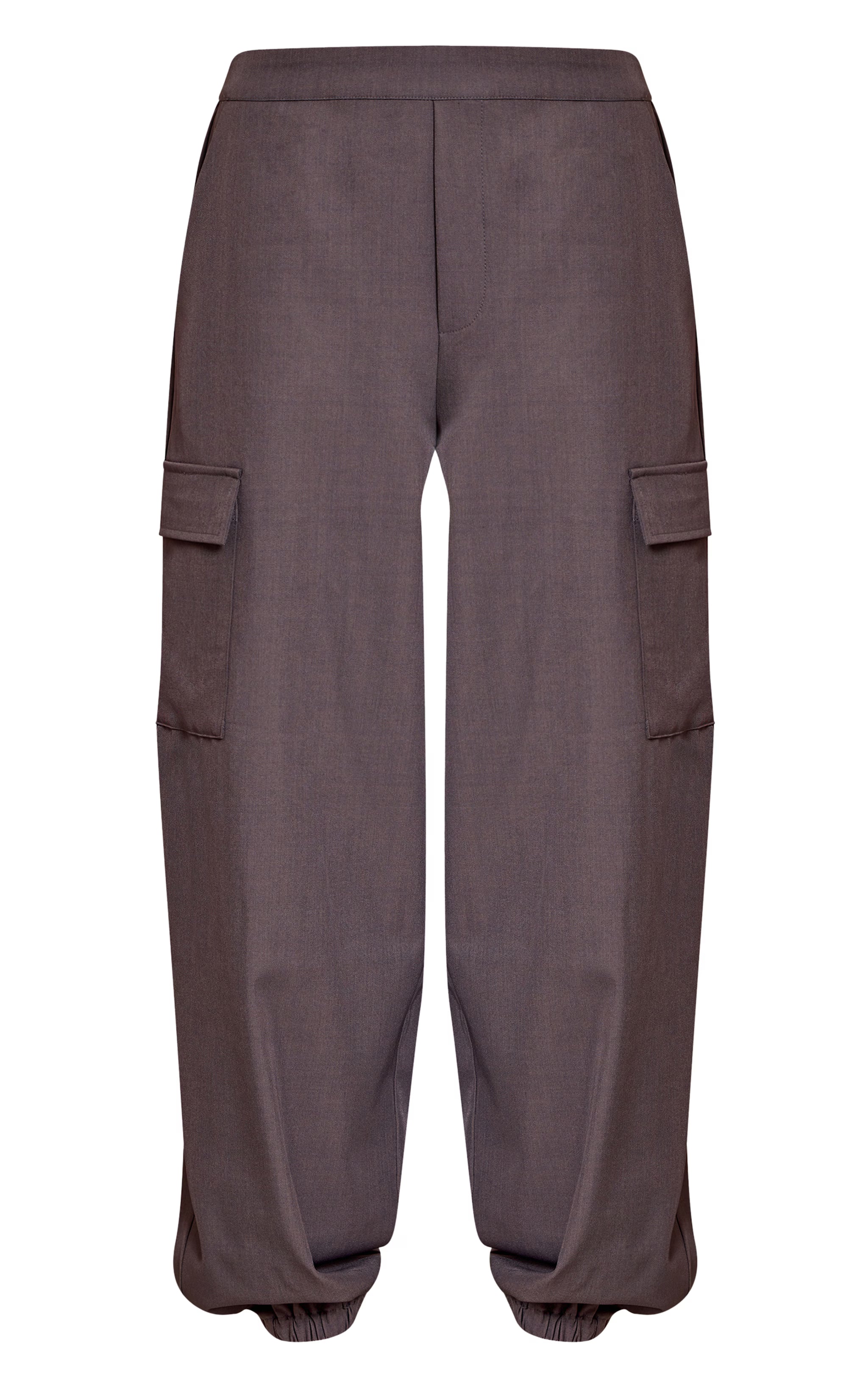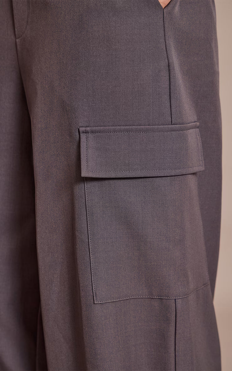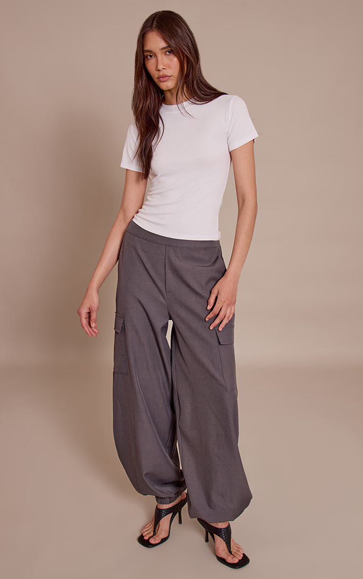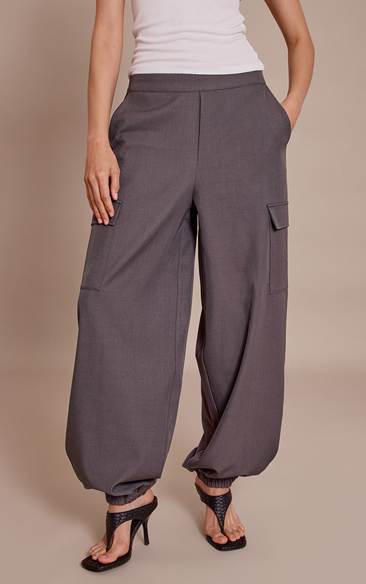 Master the art of considered daywear with these essential charcoal woven elasticated hem cargos. Crafted to deliver an effortlessly cool aesthetic, they boast a contemporary wide-leg silhouette, enhanced by practical cargo pockets and stylish elasticated hems that gather elegantly at the ankle. Team these versatile pants with a sleek, ribbed top or a fine knit sweater for a balanced look. Complete the ensemble with sophisticated high heels and statement drop earrings, asserting your elevated style with confident ease.