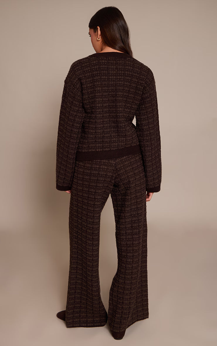 Refine your knitwear edit with a piece that blends artful detail and confident comfort. These chocolate boucle knitted wide leg pants offer a distinctive silhouette, cut with a flattering high waist and a relaxed, full-length wide leg that exudes effortless polish, all in a rich chocolate hue. Pair them with a sleek fitted knit top for a streamlined aesthetic or embrace the two piece set trend with their matching cardigan, completing the look with some chunky boots for an elevated day ensemble and accessorising with delicate gold bracelets to add a touch of knowing refinement.