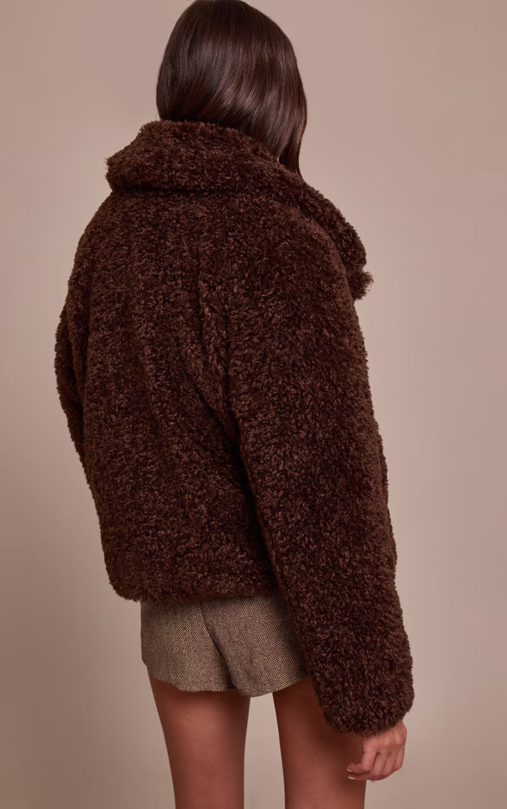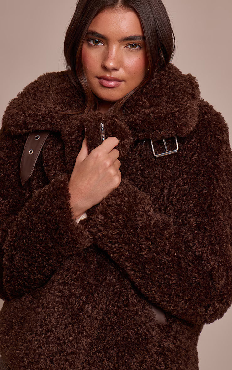 Cultivate an effortless cool with the ultimate outerwear statement. The chocolate brown borg aviator delivers a knowing edge to your daywear, featuring an artful, oversized silhouette framed by a broad lapel collar and an asymmetric zip fastening. Defined by its rich chocolate brown hue and the distinctive buckle detail at the neckline, this piece perfectly balances bold structure with relaxed appeal. Style yours over a simple cream sweater and tailored straight-leg pants, grounding the look with a pair of sleek black ankle boots for an assured day ensemble, completing the aesthetic with refined gold hoops. This coat is your definitive answer to confident, artful layering.