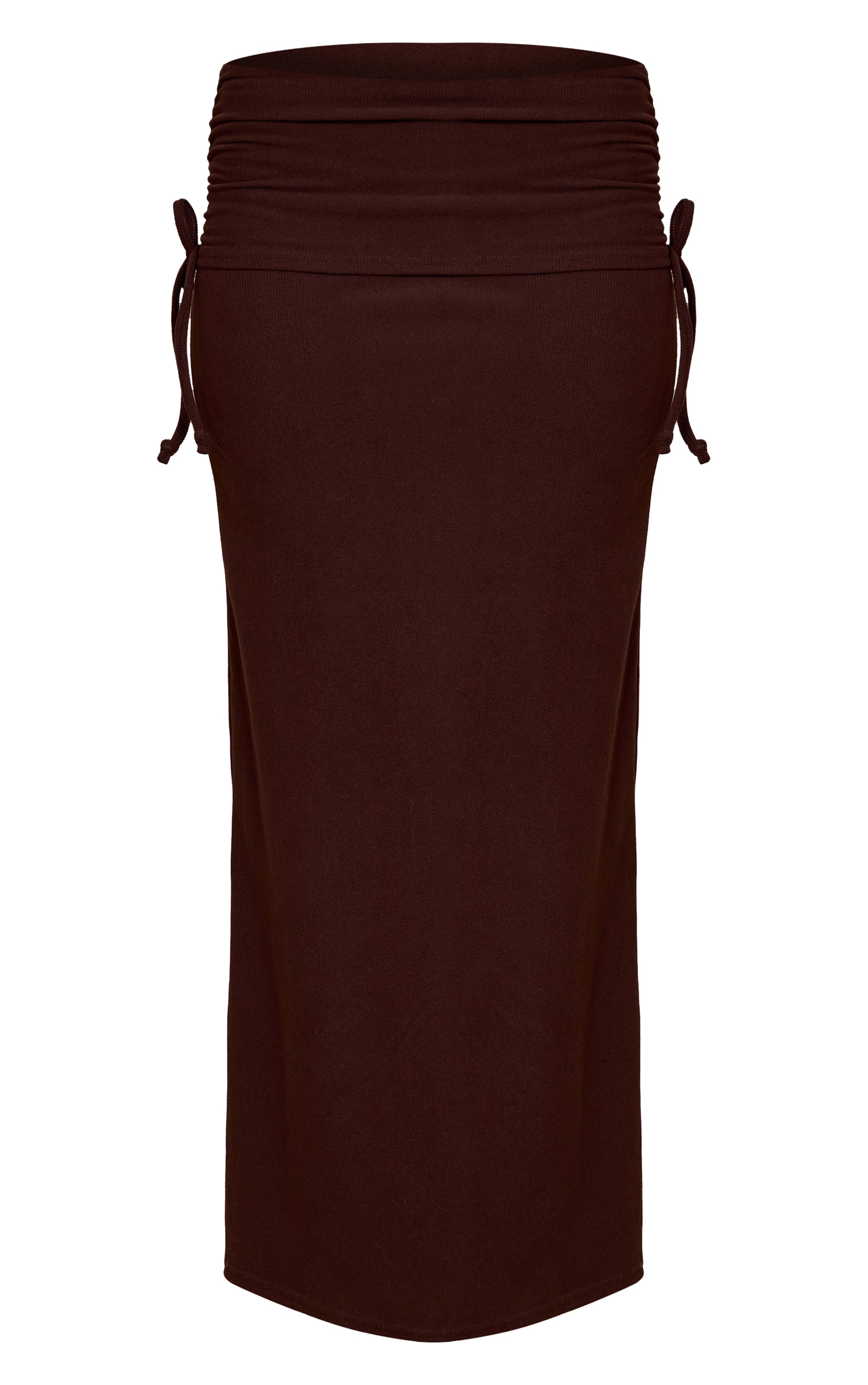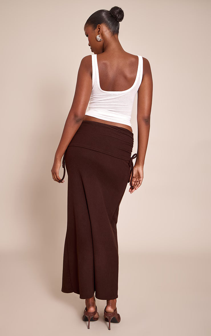 Meet your next style essential; the chocolate brushed rib ruched detail maxi skirt offers a confident base for any agenda. This rich chocolate maxi features adaptable ruching at the hip, cinched with adjustable drawstrings to create a bespoke fit that sculpts a distinctive, flattering line. Consider it with a crisp white Tank top and chic pointed heels for a day look that effortlessly transitions, adding understated silver jewelry to complete an ensemble of discerning ease.