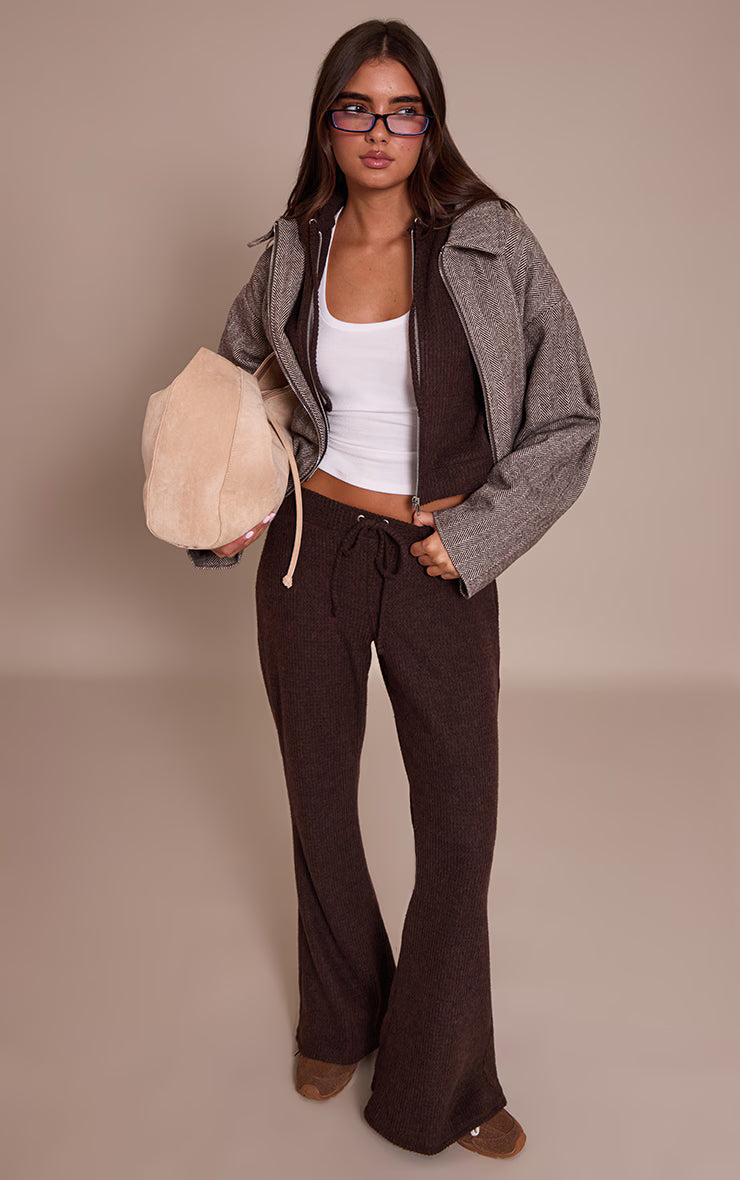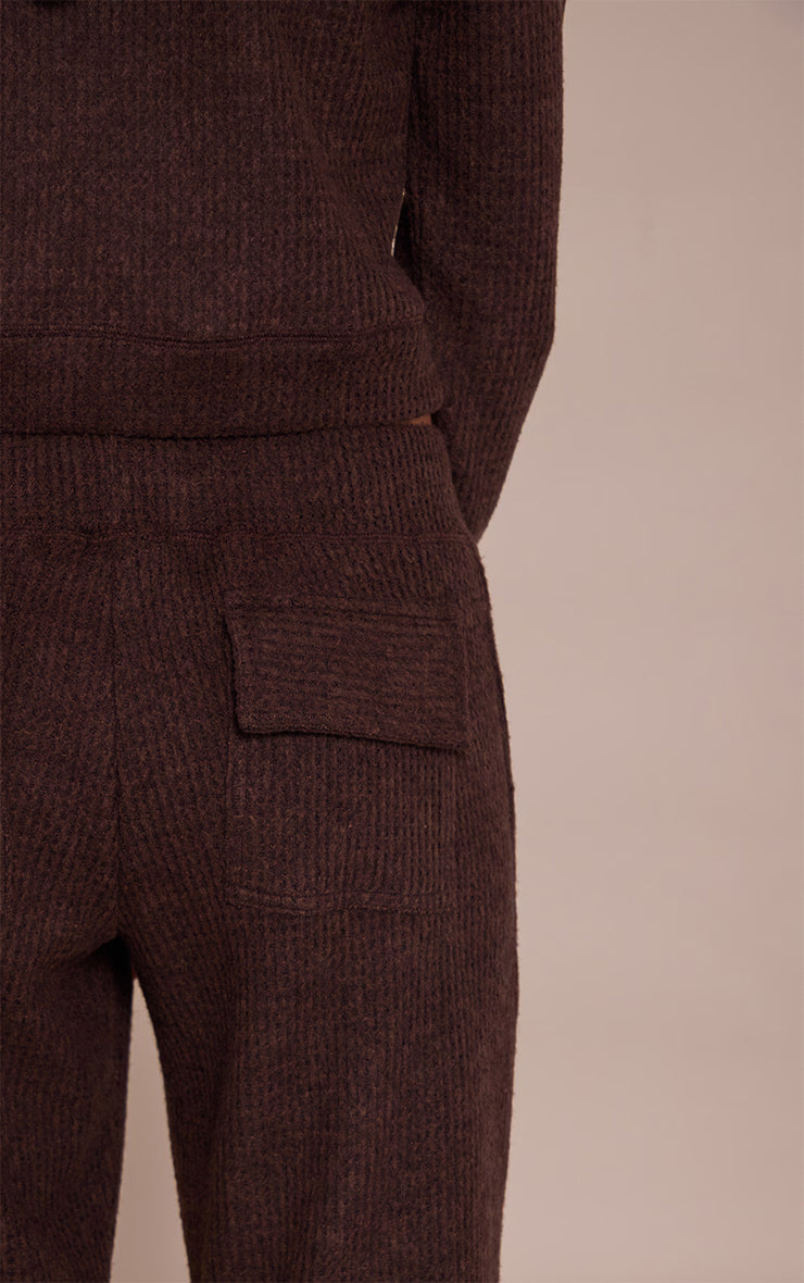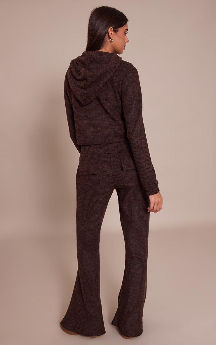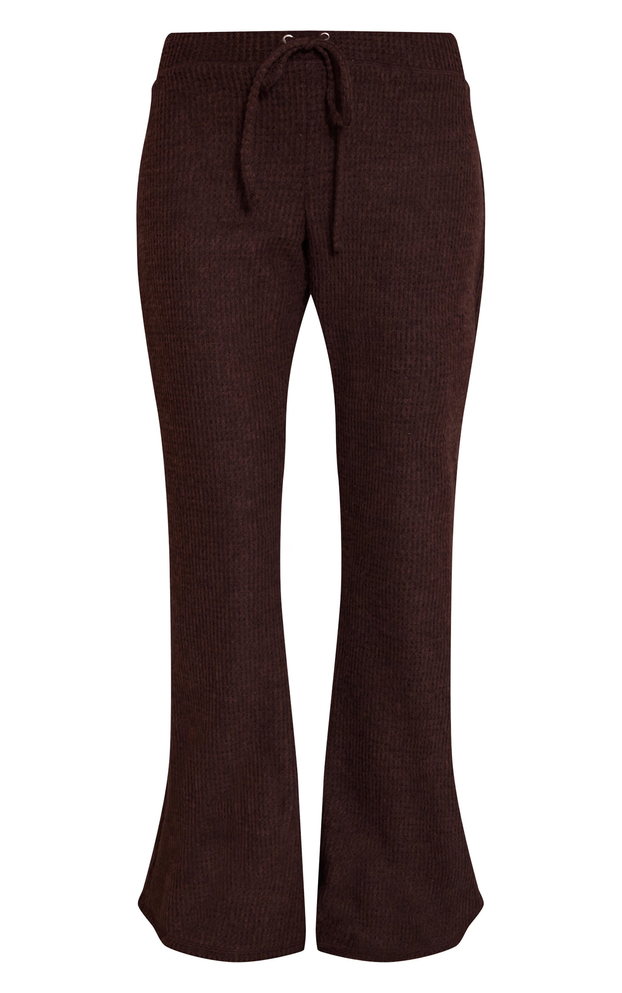 Update your casual collection with the chocolate brushed waffle rib skinny flare pant. Crafted from cosy waffle rib fabric in a deep chocolate tone, these pants feature a flattering high waist and gentle flare for a laid-back yet refined look. Style with the matching zip-up top for a coordinated finish.