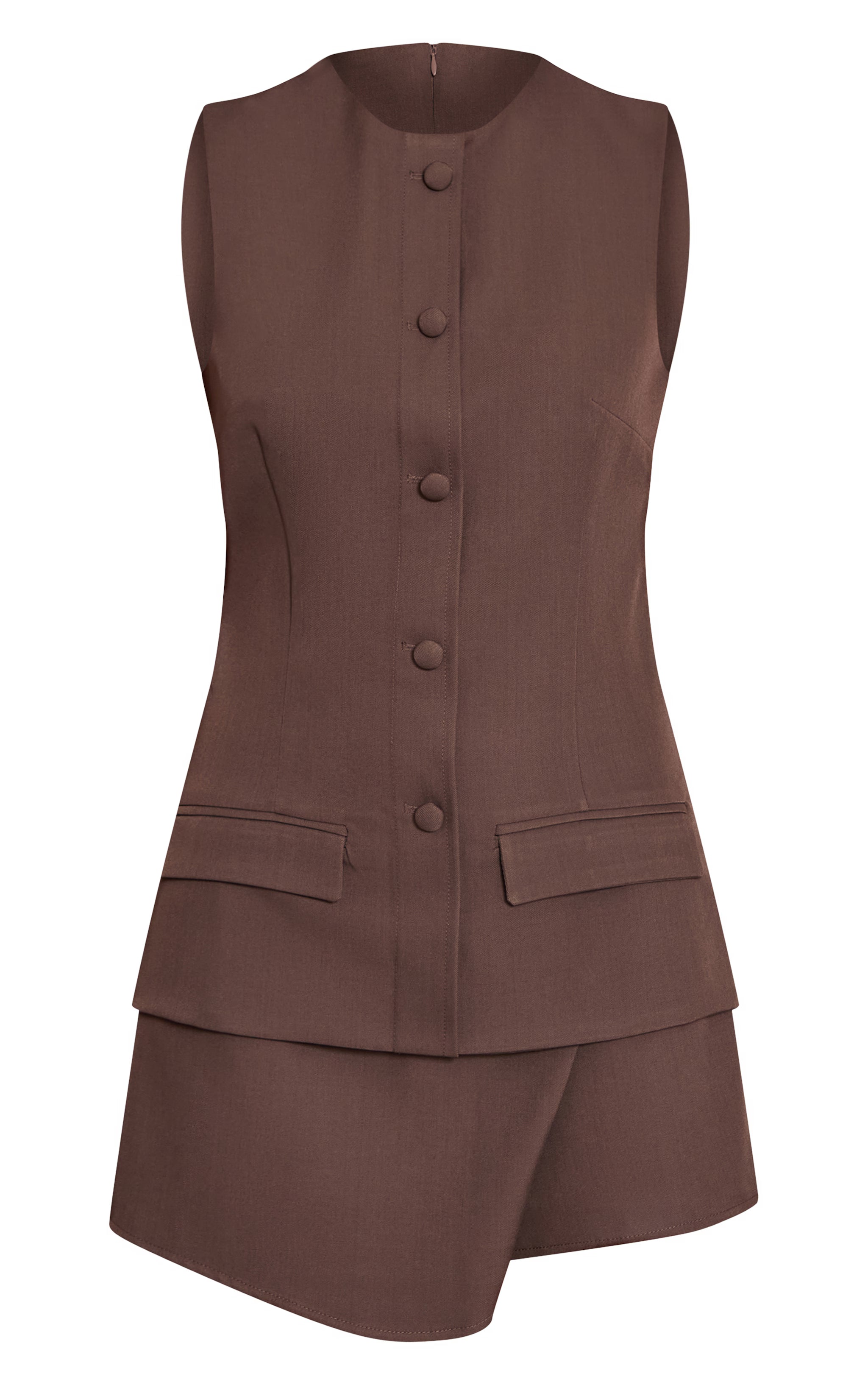 Navigate your day with assured style in a piece designed for effortless impact. The chocolate button down detail asymmetric hem shift dress presents a knowing blend of structure and modern edge, featuring a sleek round neckline and a confident sleeveless cut. Its rich chocolate hue is complemented by a full button-down fastening, leading to smart faux flap pockets and a contemporary asymmetric hem that defines its unique silhouette. For a polished day look, pair this essential with sharp boots and a sophisticated black bag, a knowing choice for confident professionals who dress with intention.