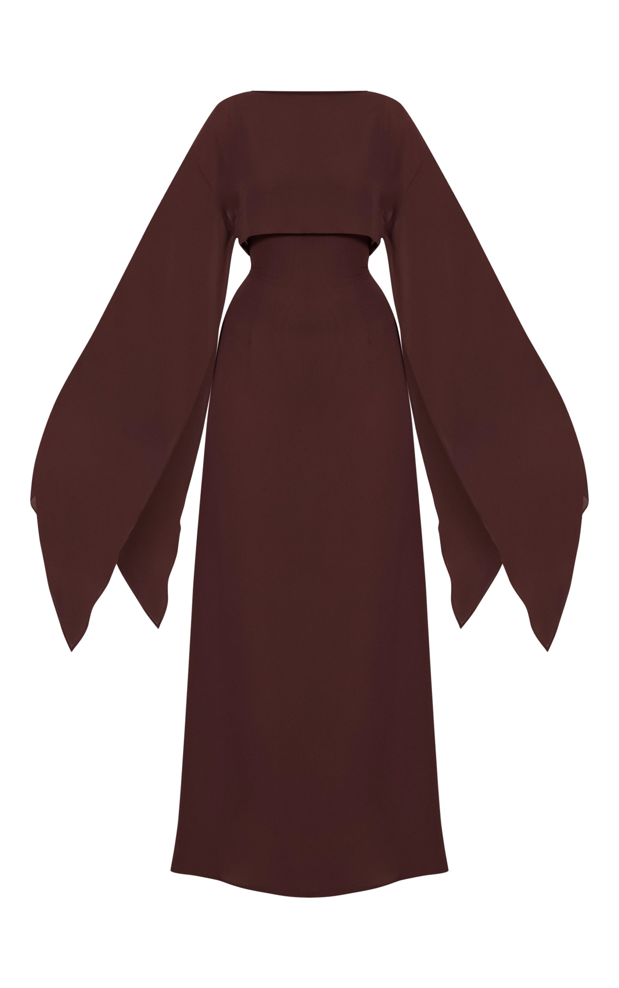 Own the narrative of your next event with a silhouette designed to captivate. The chocolate cape detail maxi dress presents an artful balance of structure and flow, featuring an elegant boat neckline and a sleek bodycon fit that descends to a sophisticated maxi length. Its defining element, the dramatic, sheer cape sleeves, creates an ethereal movement, ensuring every gesture makes a statement in this rich chocolate hue. Elevate this occasionwear piece with sharp pointed ankle boots for an unexpected edge, completing your ensemble with a stack of minimal gold bracelets for a refined finish. Ensure every occasion is marked by your distinct, artful presence.