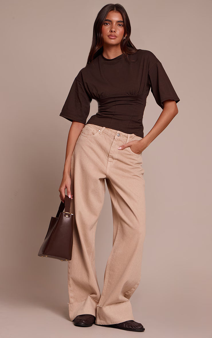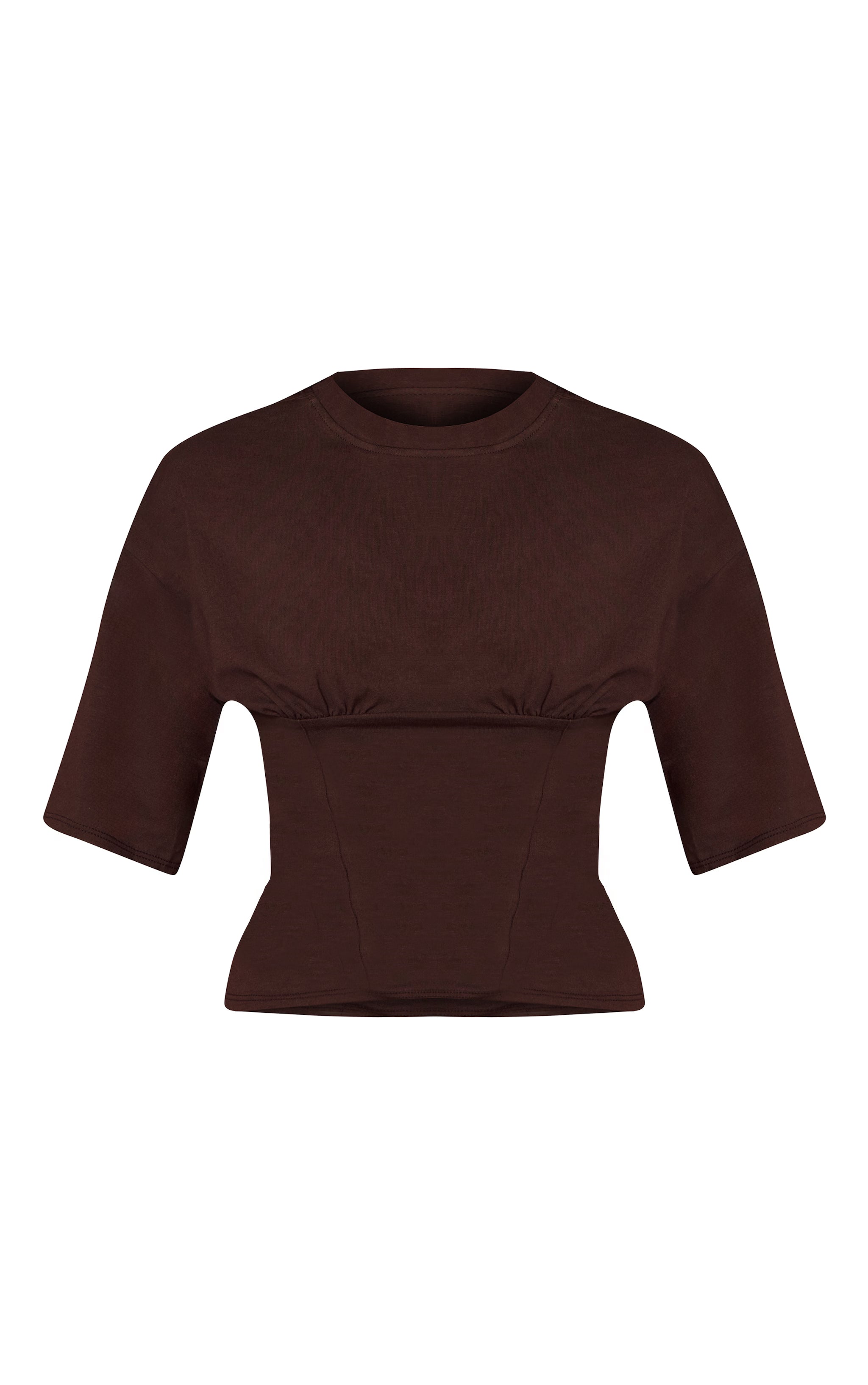 Update your essentials with a piece that works harder. The chocolate cotton ruched bust detail fitted t shirt redefines the classic tee, merging a relaxed top half with a sculpted waist for a confident silhouette. Its rich chocolate shade complements a simple crew neckline and easy short sleeves, while the expertly ruched bust and central panel detailing create a flattering, cinched finish that contours the form. Team it with high-waisted denim or tailored neutral pants, add sleek mule heels for an elevated day look, and a statement gold ring for a polished finish. It's the effortless foundation for a day-to-night ensemble.