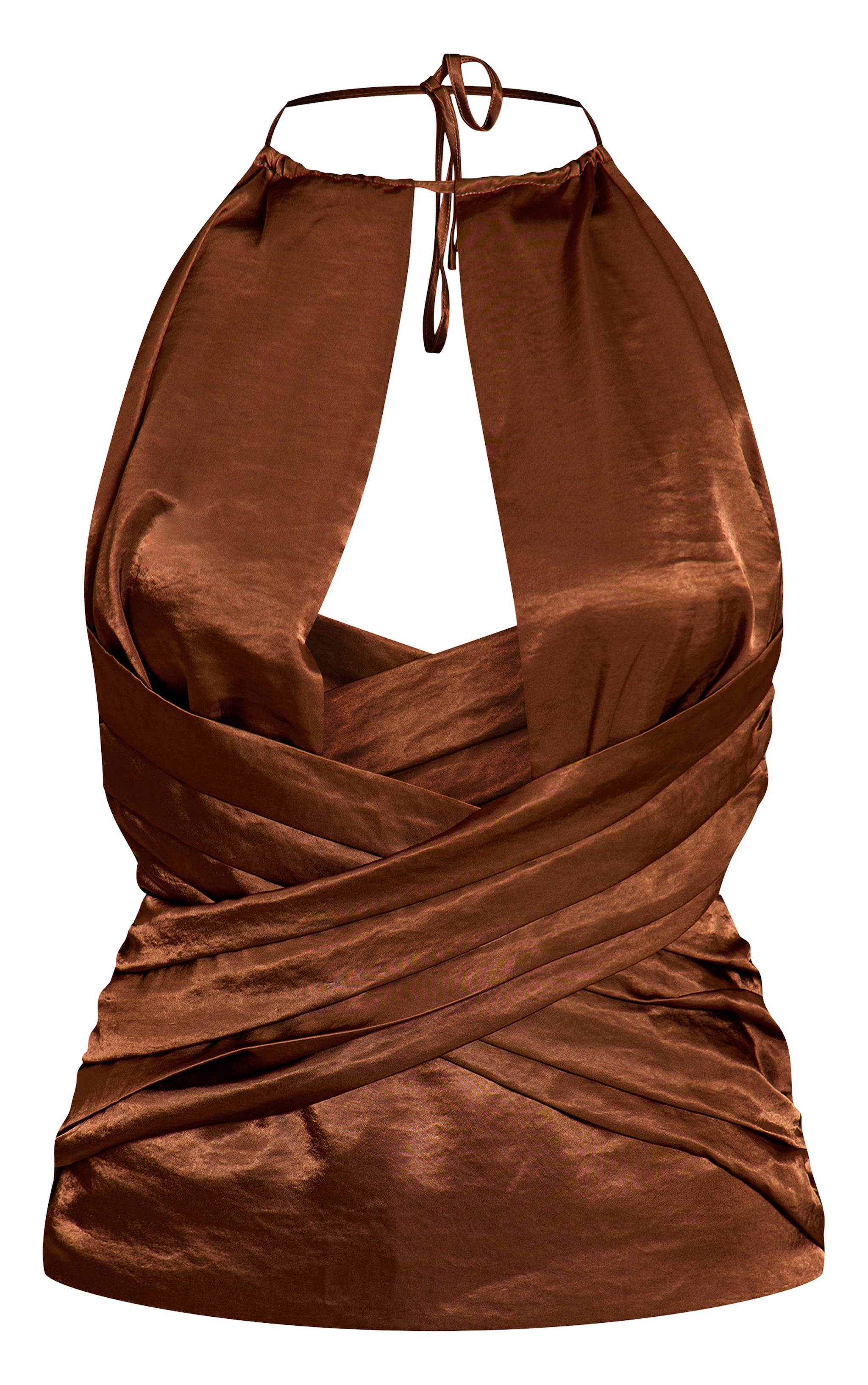 The blueprint for after-dark impact is here. The chocolate crinkle satin wrap corset top demands attention with its bold halterneck, creating a deep, artfully cut-out neckline. Intricate wrap detailing sculpts a confident, cinched silhouette that defines the waist with effortless precision. Pair this striking top with high-waisted tailored pants to balance its daring design. Complete your polished aesthetic with sleek gold heels and a pair of delicate gold stud earrings for an outlook that's both direct and undeniably self-aware.