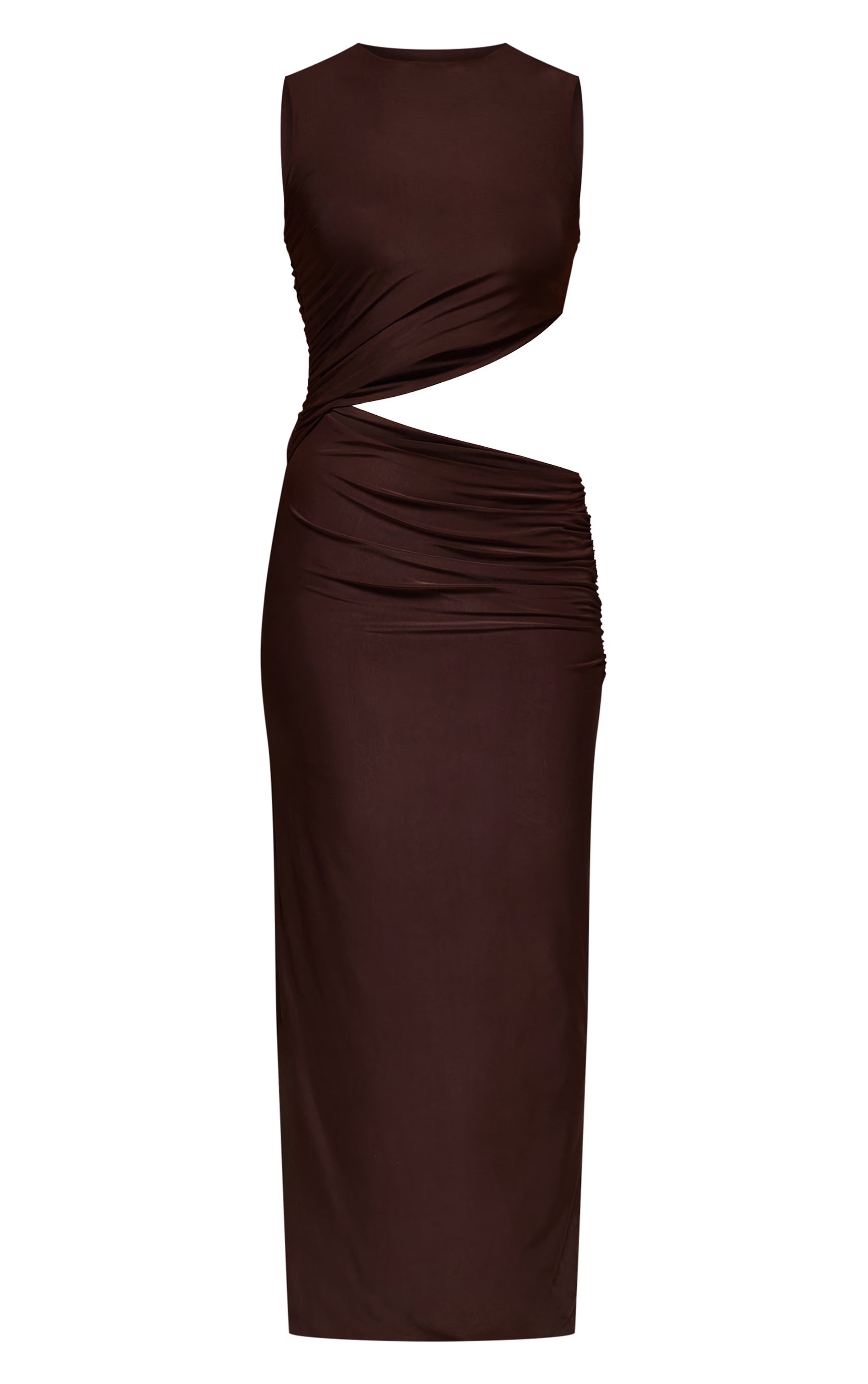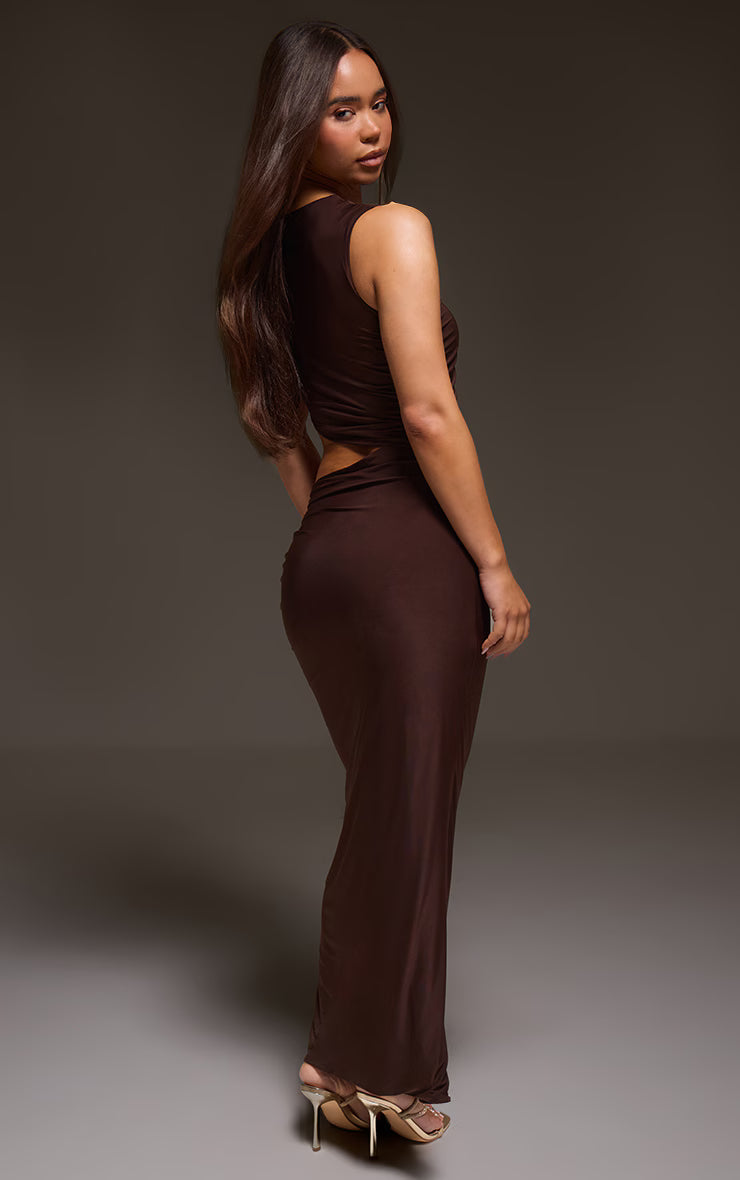 Own the evening with a dress designed to make an impact. The chocolate double layer slinky cut out maxi dress features a modern high neckline and a daring asymmetric cut-out that artfully reveals the midriff. Its sleek, double-layered design flows into a draped maxi skirt, creating an effortlessly confident silhouette. Command attention by styling yours with towering platform heels and a sleek black shoulder bag, adding a minimalist gold ring for an understated finish that leaves a lasting impression.