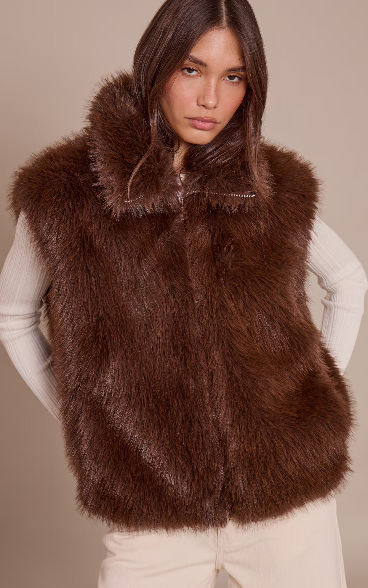 Master the art of considered layering with the ultimate statement piece. The chocolate faux fur vest offers a bold, textured update to your outerwear collection, defined by its effortlessly relaxed cut and high collar with a sleek silver-tone zip fastening. Layer this essential over a fine-knit sweater and tailored pants for an assured day look, finishing with a pair of sleek boots and a hint of delicate gold earrings for an elevated ensemble that champions confidence.