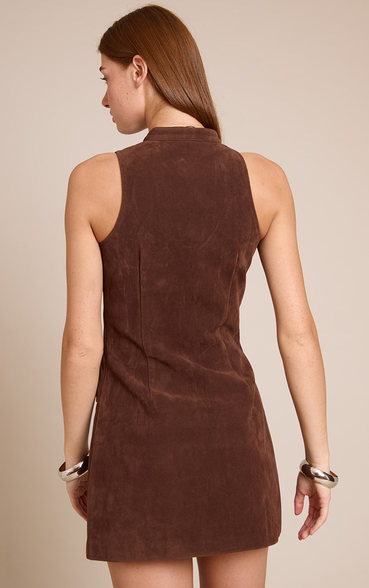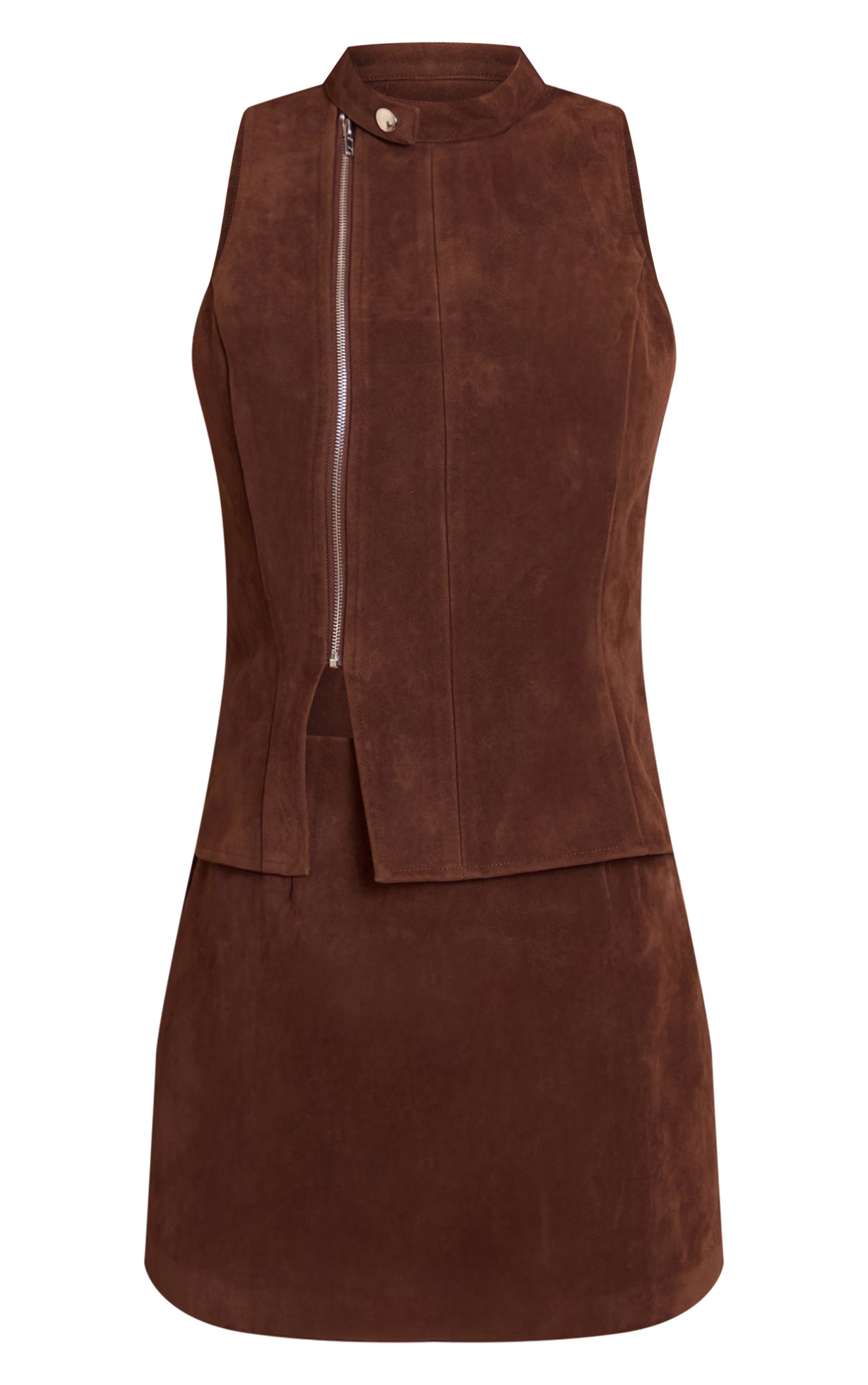 Elevate your wardrobe with the chocolate faux suede zip up mini dress. Crafted from soft faux suede in a deep chocolate tone, this mini dress features a zip-up front and tailored seam detailing for a structured silhouette. Pair with heels and a shoulder bag for a chic fall look.