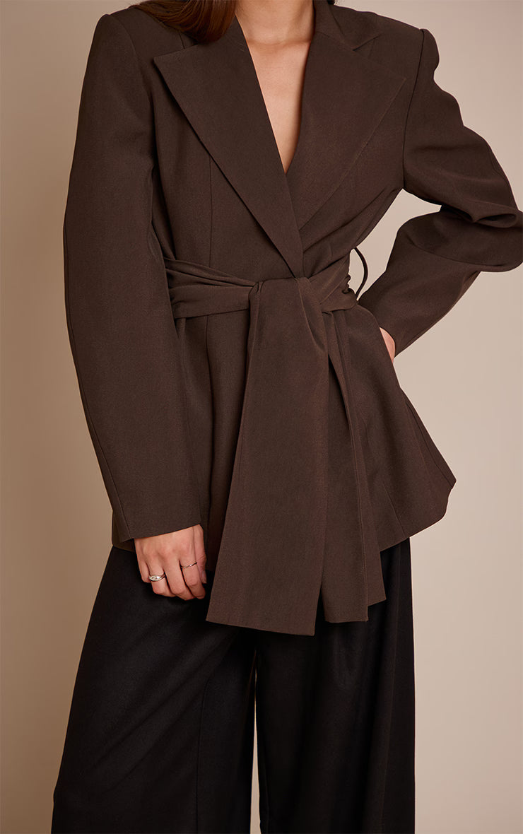 Master the art of considered power dressing with the chocolate gathered wrap waist belted blazer, a piece designed to confidently articulate your style. Its deep V-neckline and sharp, wide lapels establish a commanding presence, while the structured shoulders lead into an artful gathered wrap waist, elegantly cinched by a self-tie belt. This creates a refined silhouette, ending with a distinctive asymmetric hem that adds a contemporary edge. For an ensemble that transitions effortlessly from important meetings to elevated day events, pair this blazer with sleek black tailored pants and a striking pair of gold heels. Complete the look with oversized sunglasses for an assured finish, making every outing a statement in effortless authority.