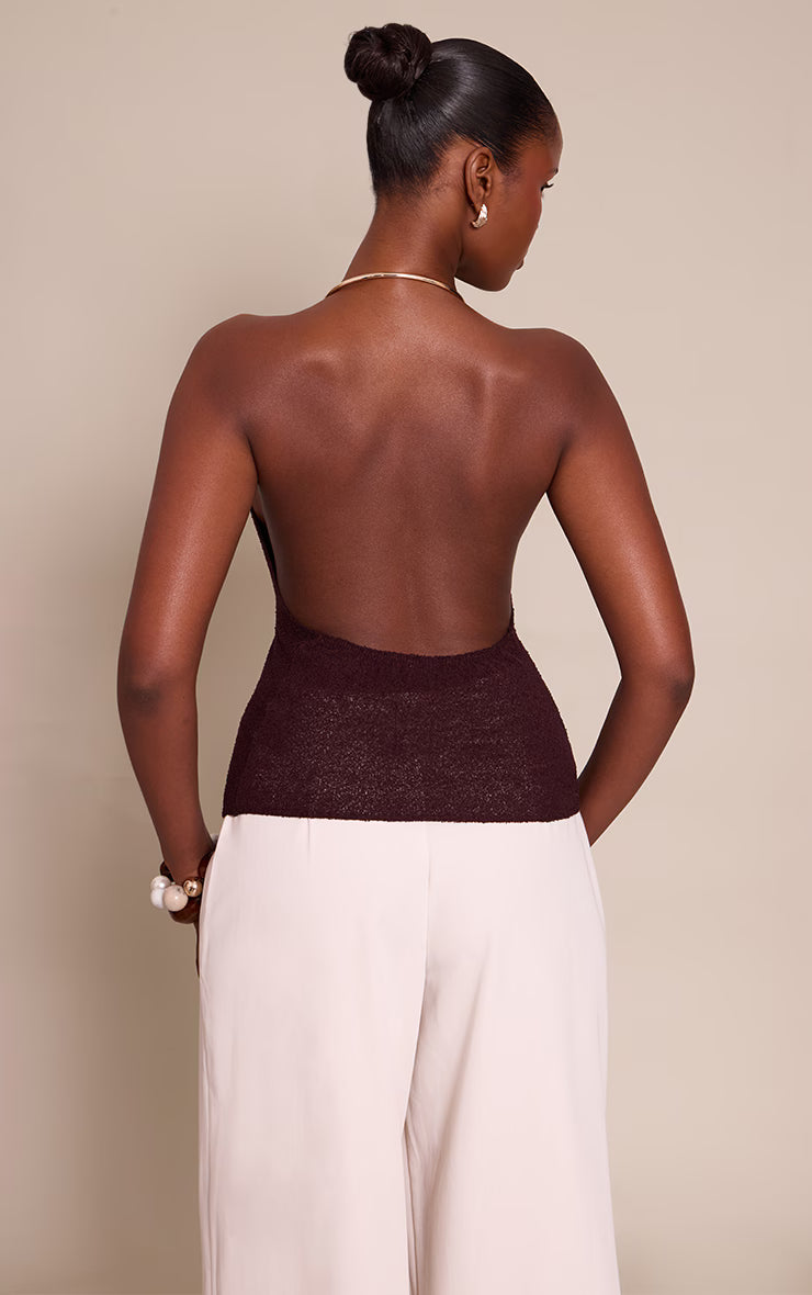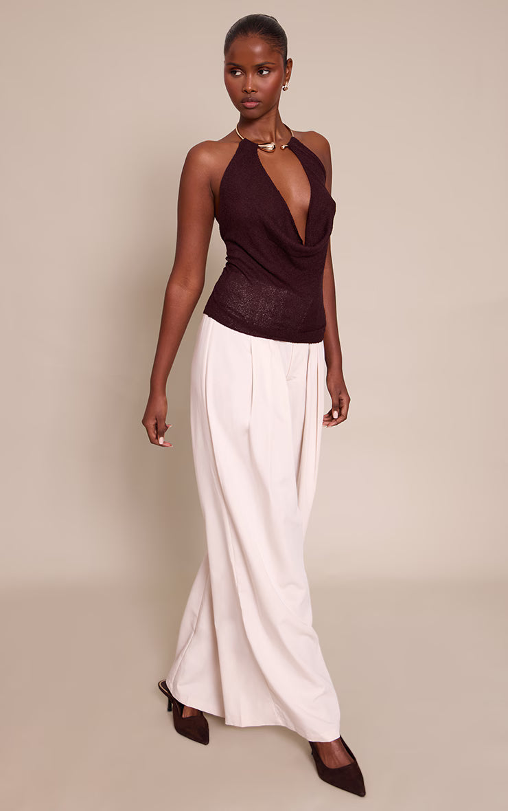 Unveiling your next undeniable evening look, the chocolate gold cuff detail knitted top delivers on every front with its bold, deep cowl plunge halter neckline. Crafted in a rich chocolate hue, this sophisticated piece sweeps elegantly, leaving the back open for a confident statement. Perfectly paired with tailored wide-leg pants and finished with elegant kitten heels, this design elevates any ensemble. Add delicate gold bracelets for a refined, head-turning finish that commands the room.