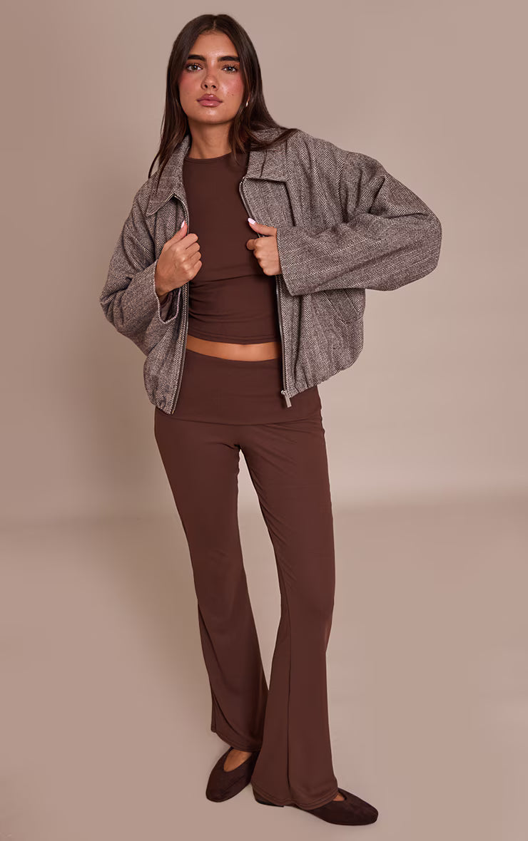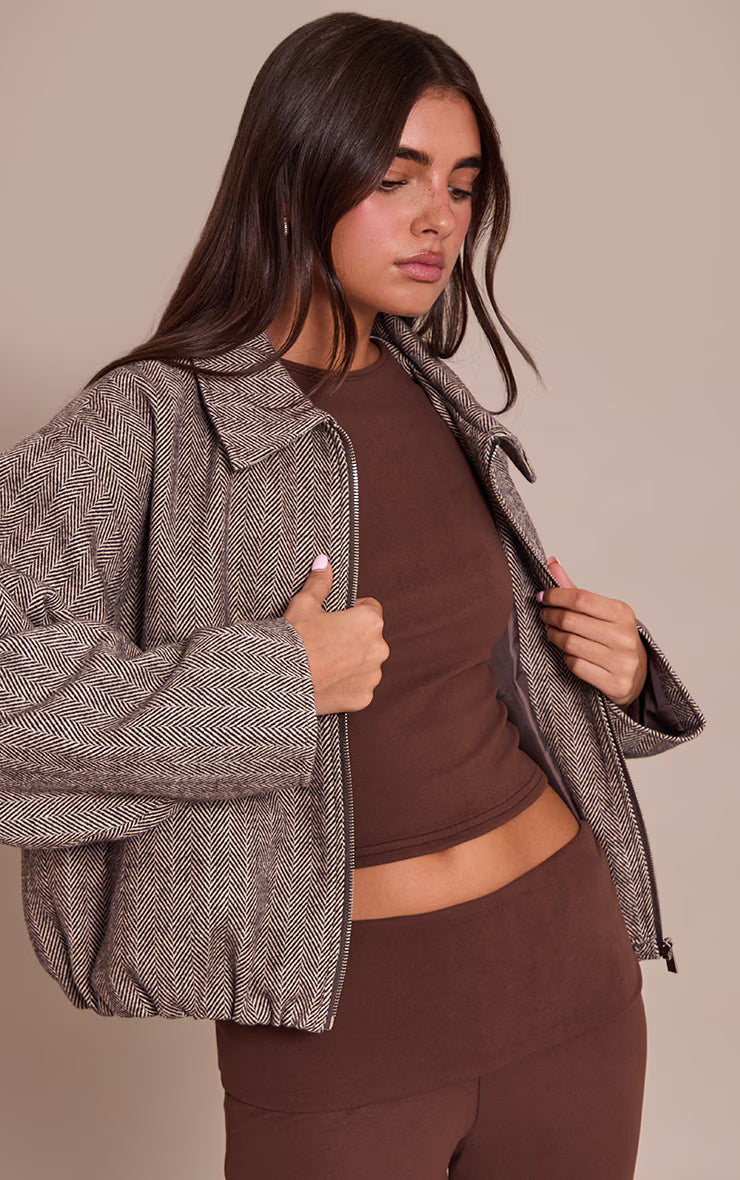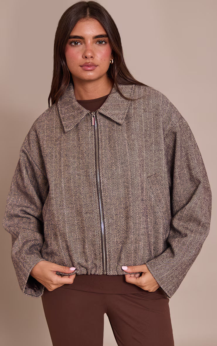 Stay stylishly on-trend with the chocolate herringbone bomber jacket. Featuring a classic bomber silhouette in textured herringbone fabric, ribbed trims, and zip fastening, it’s perfect for layering over casual or smart-casual outfits.