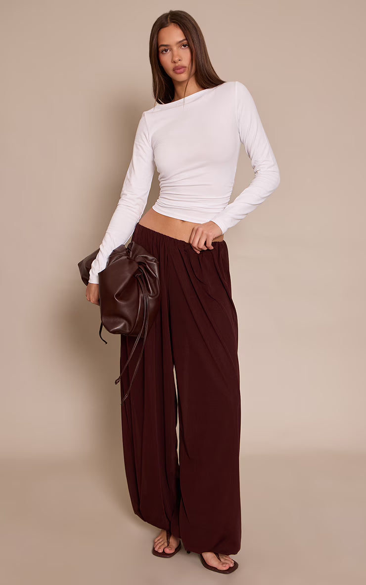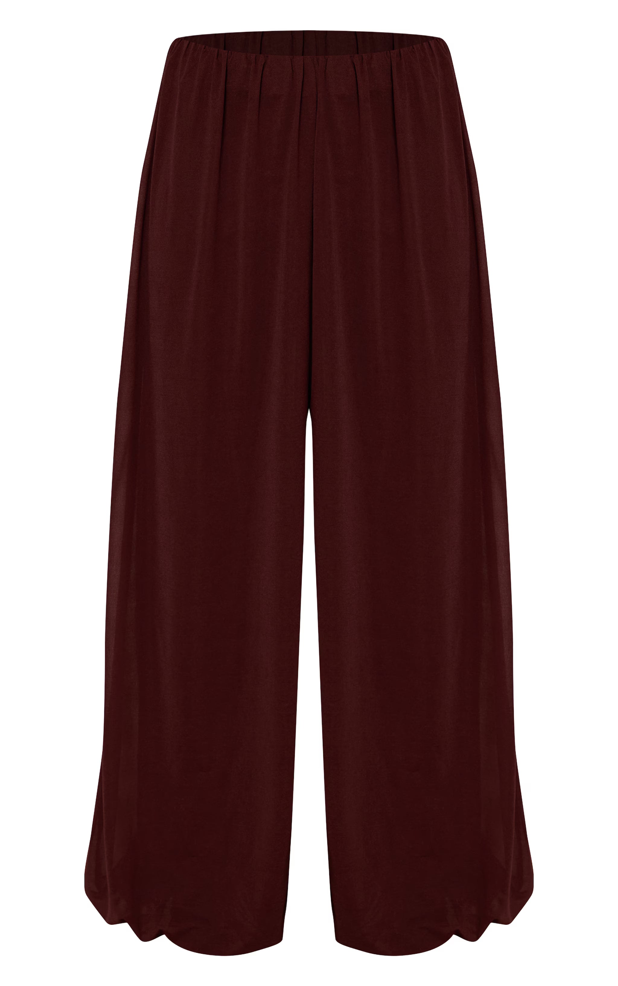 Own the moment with an artful take on elevated comfort. The chocolate lightweight chiffon balloon pants redefine daywear with their expansive, confident silhouette, featuring a relaxed waistband that flows into a dramatically wide leg, subtly gathered to create that distinctive balloon shape. This deep chocolate hue grounds the versatile design, making an effortless statement. Pair these essential pants with a sleek, fitted bandeau or a crisp oversized shirt, then complete your confident aesthetic with sleek black boots and a bold chunky chain necklace for an undeniably self-assured presence.