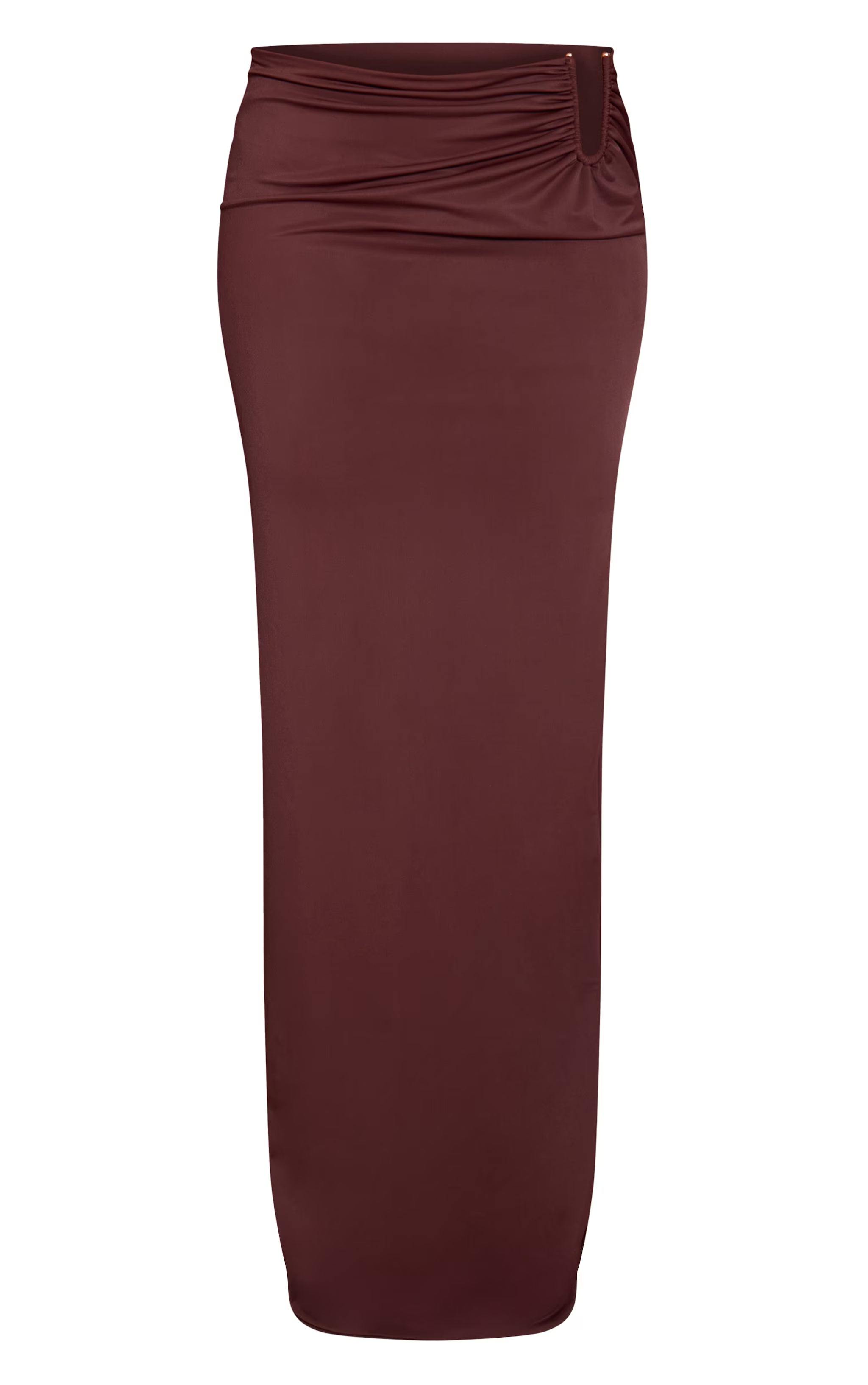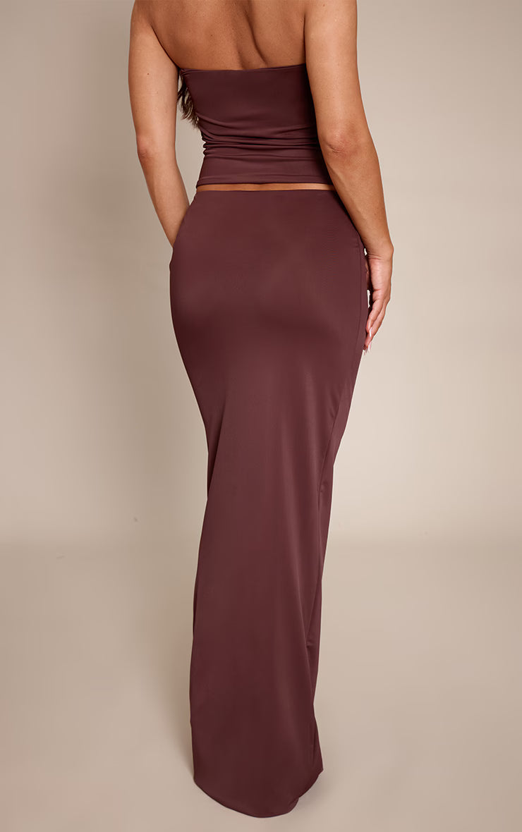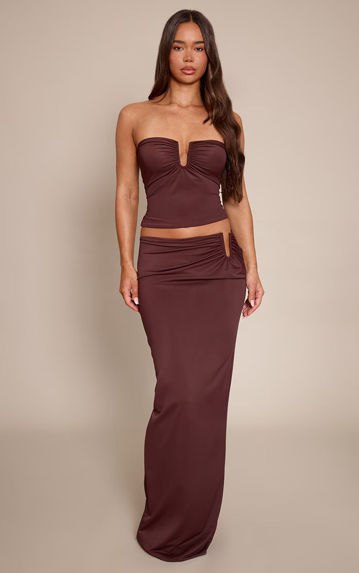 Make a statement that echoes confidence in the chocolate matte sculpt v bar ruched maxi skirt. This chocolate-hued maxi silhouette features a striking V bar cut-out at the hip, cinched with artful ruching that accentuates its sleek lines. Pair this with its matching bandeau top for a cohesive look, grounded by pointed boots to elevate the drama, then accessorise with delicate gold earrings to complete this knowing evening ensemble. Own the evening in this unapologetically bold piece.