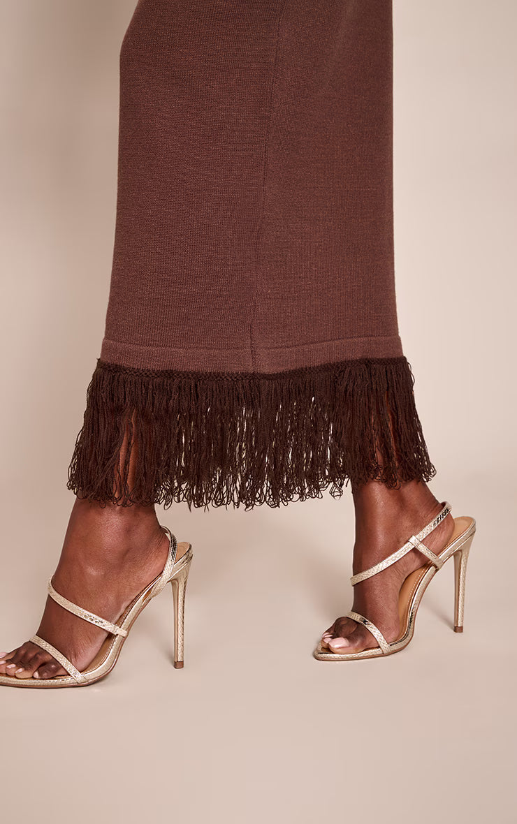Command attention after dark with the chocolate maxi loop knit maxi skirt, a bold choice in rich chocolate. Its elongated silhouette is elevated by dramatic fringe detailing at both the waist and hem, creating movement with every confident step. Complete the two piece set with its matching knit top for a streamlined aesthetic, or pair it with a sleek camisole for an alternative evening look. Finish the ensemble with minimalist heeled mules and delicate pearl earrings, ready for any after-dark occasion.